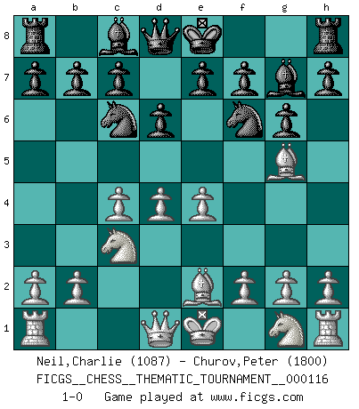 Last move : 1-0 2010 September 2 23:1:25 [Event "FICGS__CHESS__THEMATIC_TOURNAMENT__000116"] [Site "FICGS"] [Date "2010.07.21"] [Round "1"] [White "Neil,Charlie"] [Black "Churov,Peter"] [Result "1-0"] [WhiteElo "1087"] [BlackElo "1800"] 1.d4 Nf6 2.c4 g6 3.Nc3 Bg7 4.e4 d6 5.Be2 Nc6 6.Bg5 1-0 This chess game has been lost on time (started : 2010.07.21 0:37:6) King's Indian : 5.Be2 Player White won this chess game. Follow this game move after move (download)A bad plan is better than none at all. (Frank Marshall) Gegen einen Schachcomputer zu verlieren ist wie Löcher in den Strümpfen zuhaben. Es ist nicht peinlich, solange man der einzige ist der es weiß. (Anonymous) Es muy difícil jugar en contra de la teoría de Einstein. - en su primera derrota en contra de Fischer (Mikhail Tal) Les Echecs sont et restent toujours un combat, un combat intégral comme la boxe, la lutte ou un autre sport, et où il doit y avoir un vainqueur et un vaincu. (Joseph Emil Diemer) May I never be complete. May I never be content. May I never be perfect. Deliver me, Tyler, from being perfect and complete. (Chuck Palahniuk, Fight Club)