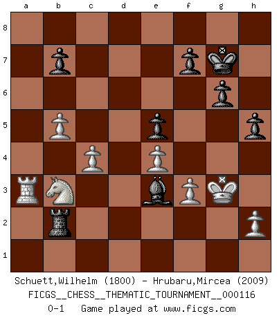 Last move : 0-1 2010 November 7 23:59:41 [Event "FICGS__CHESS__THEMATIC_TOURNAMENT__000116"] [Site "FICGS"] [Date "2010.07.21"] [Round "1"] [White "Schuett,Wilhelm"] [Black "Hrubaru,Mircea"] [Result "0-1"] [WhiteElo "1800"] [BlackElo "2009"] 1.d4 Nf6 2.c4 g6 3.Nc3 Bg7 4.e4 d6 5.f3 O-O 6.Be3 c5 7.dxc5 dxc5 8.Qxd8 Rxd8 9.Bxc5 Nc6 10.Nge2 Nd7 11.Ba3 Nde5 12.Nf4 e6 13.Rd1 Rxd1+ 14.Kxd1 Na5 15.b3 Nxf3 16.gxf3 Bxc3 17.Bh3 Bg7 18.Ke2 Nc6 19.Rd1 Be5 20.Bc1 a5 21.Kf2 a4 22.Nd3 Bd4+ 23.Kg3 axb3 24.axb3 Ra1 25.b4 Be3 26.b5 Nd4 27.Bf1 Nb3 28.Nc5 Rxc1 29.Rd8+ Kg7 30.Nxb3 Rxf1 31.Rxc8 Rg1+ 32.Kh3 h5 33.Ra8 Rb1 34.Ra3 Rb2 35.Kg3 e5 0-1 King's Indian : Saemisch, 5...O-O Kingside Castling by player Black (move 5) Player Black won this chess game. Follow this game move after move (download)Pawn endings are to Chess what putting is to golf. (Cecil Purdy) Fischer: 'Remis!?' Uhlmann: 'Aber es muss doch dreimal Zugwiederholung sein!' Fischer: 'Sie nehmen das Remis an, wie ich es sage, sonst spiele ich weiter und werde Sie dann schlagen!' (Robert James Fischer) El Ajedrez es despiadado: debes de estar preparado para matar gente. (Nigel Short) Des combinaisons [dans le jeu d'échecs] pareilles à des mélodies. Je crois entendre pour ainsi dire la musique des coups... (Vladimir Nabokov) It is not true that people stop pursuing dreams because they grow old, they grow old because they stop pursuing dreams. (Gabriel Garcia Marquez)
