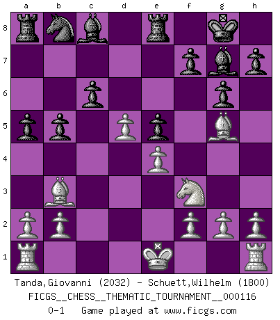 Last move : 0-1 2010 September 27 17:58:37 [Event "FICGS__CHESS__THEMATIC_TOURNAMENT__000116"] [Site "FICGS"] [Date "2010.07.21"] [Round "1"] [White "Tanda,Giovanni"] [Black "Schuett,Wilhelm"] [Result "0-1"] [WhiteElo "2032"] [BlackElo "1800"] 1.d4 Nf6 2.c4 g6 3.Nc3 Bg7 4.e4 d6 5.Nf3 O-O 6.Be2 e5 7.dxe5 dxe5 8.Qxd8 Rxd8 9.Bg5 Re8 10.Nd5 Nxd5 11.cxd5 c6 12.Bc4 b5 13.Bb3 a5 0-1 King's Indian : Andersson variation Kingside Castling by player Black (move 5) Player Black won this chess game. Follow this game move after move (download)It is not a move, even the best move that you must seek, but a realizable plan. (Eugene Znosko-Borovsky) Ich bin stolz ein Bulgare zu sein. (Veselin Topalov) Un buen jugador siempre tiene buena suerte. (José Raúl Capablanca) L'action d'une oeuvre littéraire se déroule sur un champ de bataille. Les masques et les types du drame moderne correspondent aux pièces du jeu d'échecs. L'intrigue correspond aux coups et aux gambits, c'est à dire aux techniques du jeu telles qu'utilisées et interprétées par les joueurs. Les tactiques et les péripéties [mouvements] correspondent aux coups exécutés par l'adversaire. (Viktor Shklovsky) It's not the will to win, but the will to prepare to win that makes the difference. (Bear Bryant)
