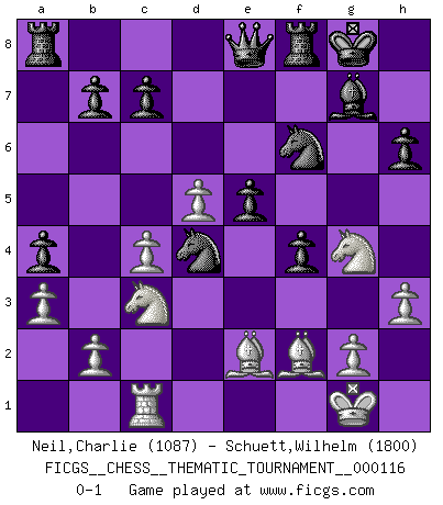 Last move : 0-1 2010 August 28 10:51:27 [Event "FICGS__CHESS__THEMATIC_TOURNAMENT__000116"] [Site "FICGS"] [Date "2010.07.21"] [Round "1"] [White "Neil,Charlie"] [Black "Schuett,Wilhelm"] [Result "0-1"] [WhiteElo "1087"] [BlackElo "1800"] 1.d4 Nf6 2.c4 g6 3.Nc3 Bg7 4.e4 d6 5.Be2 O-O 6.Nf3 e5 7.d5 a5 8.O-O Na6 9.Bg5 h6 10.Be3 Ng4 11.Bd2 f5 12.exf5 gxf5 13.Rc1 Bd7 14.h3 Nf6 15.a3 Qe8 16.Nh2 a4 17.f4 Nc5 18.fxe5 dxe5 19.Be3 Nb3 20.Rc2 f4 21.Bf2 Bf5 22.Ng4 Bxc2 23.Qxc2 Nd4 24.Re1 Nxc2 25.Rc1 Nd4 0-1 King's Indian : 5.Be2 Kingside Castling by player Black (move 5) Kingside Castling by player White (move 8) Player Black won this chess game. Follow this game move after move (download)You know, comrade Pachman, I don't enjoy being a Minister, I would rather play Chess like you. (Che Guevara) Warum muß ich gegen diesen IDIOTEN verlieren? (Aaron Nimzowitsch) Dejen al perfeccionista jugar por correo. (Yasser Seirawan) Vous m'avez demandé de vous exposer quel est le fondement de la prière. Je ne fais que préparer les pièces du jeu sur la table... Nous sera-t-il permis d'en adopter les règles et si nous les appliquons scrupuleusement nous ne tarderons pas à faire mat le Roi divin ! Il ne pourra échapper à nos mains. (Sainte Thérèse d'Avila, Chemin de perfection) CHESS, n. f. [echecs, Fr.] A nice and abstruse game, in which two sets of puppets are moved in opposition to each other. (Dr Samuel Johnson, A Dictionary Of The English Language, 1755)