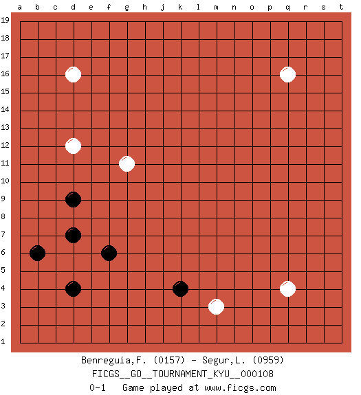 Last move : 0-1 2010 October 5 9:20:46 [Event "FICGS__GO__TOURNAMENT_KYU__000108"] [Site "FICGS"] [Date "2010.07.22"] [Round "1"] [Black "Benreguia,Frederic"] [White "Segur,Laurine"] [Result "0-1"] [Rating 1 "0157"] [Rating 2 "0959"] 1.d7 q16 2.f6 d16 3.b6 q4 4.k4 m3 5.d4 d12 6.d9 g11 0-1 This go game has been lost on time (started : 2010.07.22 13:29:34) Here are the names of the openings (joseki) played in the four corners : Player White won this Go (weiqi, baduk) game. Follow this game move after move (download)Eyes win semiais. (Anonymous) Hold em is to stud what chess is to checkers. (Johnny Moss)