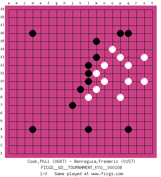 Last move : 1-0 2010 September 6 11:19:16 [Event "FICGS__GO__TOURNAMENT_KYU__000108"] [Site "FICGS"] [Date "2010.07.22"] [Round "1"] [Black "Cook,Phil"] [White "Benreguia,Frederic"] [Result "1-0"] [Rating 1 "0687"] [Rating 2 "0157"] 1.q4 q10 2.d4 s10 3.d16 q12 4.q16 p13 5.p16 s13 6.m13 n10 7.l10 m9 8.l4 n12 9.l12 l8 10.k9 p8 11.j7 m11 12.l11 o14 13.m15 1-0 This go game has been lost on time (started : 2010.07.22 13:29:34) Here are the names of the openings (joseki) played in the four corners : Corner q16 : q12 q16 This joseki is unknown. A weak or weird move has probably been played in this corner. Corner q4 : q4 m9 Hoshi (Hwajeom, Seongjeom, Xingwei`) 4-4 Point. The star or hoshi (4-4) point, emphasizing influence at the potential expense of territory. Player Black won this Go (weiqi, baduk) game. Follow this game move after move (download)It is difficult to know exactly what you are doing. (Pierre Audouard) Now be brave and don't look back. Don't look back. (Shmi Skywalker in Star Wars ep.1)
