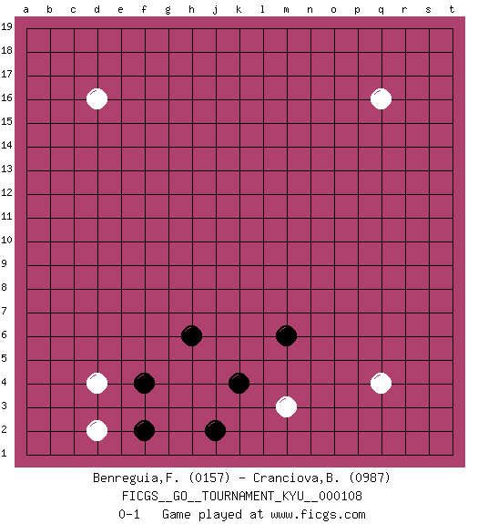 Last move : 0-1 2010 September 12 8:40:49 [Event "FICGS__GO__TOURNAMENT_KYU__000108"] [Site "FICGS"] [Date "2010.07.22"] [Round "1"] [Black "Benreguia,Frederic"] [White "Cranciova,Bogdan"] [Result "0-1"] [Rating 1 "0157"] [Rating 2 "0987"] 1.h6 d4 2.f2 d2 3.f4 q4 4.k4 m3 5.m6 q16 6.j2 d16 0-1 This go game has been lost on time (started : 2010.07.22 13:29:34) Here are the names of the openings (joseki) played in the four corners : Corner d4 : h6 d4 This joseki is unknown. A weak or weird move has probably been played in this corner. Player White won this Go (weiqi, baduk) game. Follow this game move after move (download)The poor player plays the opponent's game for him. (Anonymous) Do you know these so called Volunteers don't even get paid! (Simpsons)