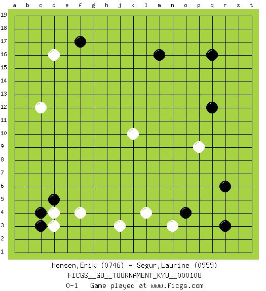 Last move : 0-1 2010 October 29 10:32:55 [Event "FICGS__GO__TOURNAMENT_KYU__000108"] [Site "FICGS"] [Date "2010.07.22"] [Round "1"] [Black "Hensen,Erik"] [White "Segur,Laurine"] [Result "0-1"] [Rating 1 "0746"] [Rating 2 "0959"] 1.q16 d4 2.r3 d16 3.f17 j3 4.c3 d3 5.c4 c12 6.m16 k10 7.q12 n3 8.o4 l4 9.d5 f4 10.r6 p9 0-1 This go game has been lost on time (started : 2010.07.22 13:29:34) Here are the names of the openings (joseki) played in the four corners : Corner d16 : d16 f17 Hoshi (Hwajeom, Seongjeom, Xingwei`) 4-4 Point. The star or hoshi (4-4) point, emphasizing influence at the potential expense of territory. Ikken Kakari (Hankan Keolch'im, Yi Gua`jiao~, 1-Space Low Approach). Black 2 is the standard approach move to the 4-4. Corner q4 : r3 n3 San-San (Sam-Sam, San-San) 3-3 Point. The San-San (3-3) point, emphasizing territory at the expense of influence. Player White won this Go (weiqi, baduk) game. Follow this game move after move (download)If you have lost four corners, resign. (Anonymous) When a man with money meets a man with experience, the man with experience leaves with money and the man with money leaves with experience. (Anonymous)