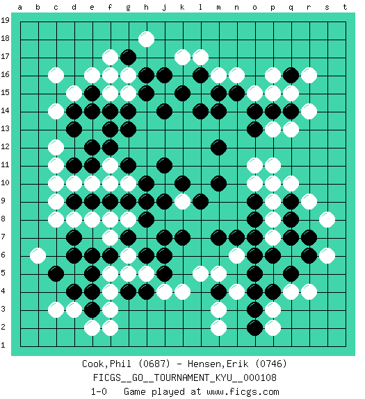 Last move : 1-0 2010 November 24 22:43:6 [Event "FICGS__GO__TOURNAMENT_KYU__000108"] [Site "FICGS"] [Date "2010.07.22"] [Round "1"] [Black "Cook,Phil"] [White "Hensen,Erik"] [Result "1-0"] [Rating 1 "0687"] [Rating 2 "0746"] 1.q16 e16 2.p4 d5 3.g4 d3 4.h16 m16 5.e14 r4 6.e6 d10 7.d7 f5 8.e5 f4 9.r7 q10 10.m10 q13 11.o14 p15 12.m14 p16 13.p14 q15 14.q14 r14 15.e11 e10 16.h10 f11 17.e12 f8 18.f6 g5 19.h4 h7 20.k7 h9 21.h6 g6 22.g7 f7 23.e4 f3 24.e3 e2 25.d4 c3 26.c5 k9 27.j7 g8 28.k10 c8 29.d6 b6 30.l9 h5 31.j6 r16 32.g9 j10 33.j11 g10 34.j9 j4 35.j5 k4 36.m4 s6 37.h8 c12 38.g7 f2 39.f9 f15 40.f13 e8 41.e9 d8 42.d9 c9 43.d11 f10 44.h9 c11 45.g11 d15 46.f12 c10 47.e15 c14 48.d14 c16 49.f14 s8 50.q8 r9 51.o9 g15 52.g13 f17 53.h15 k17 54.k15 l5 55.m7 m5 56.o5 n6 57.n7 m3 58.o6 l15 59.l14 o15 60.n15 q4 61.q5 j15 62.j14 n16 63.m15 p3 64.o3 n4 65.o4 p2 66.o2 p13 67.o13 o11 68.m12 p9 69.q9 p8 70.o8 p7 71.o7 q6 72.p10 o10 73.p6 p11 74.q7 p10 75.r6 m2 76.l16 l17 77.j16 h18 78.g17 g16 79.g14 f16 80.d13 1-0 Here are the names of the openings (joseki) played in the four corners : Corner d4 : d5 g4 Takamoku (Gomok, Gaomu`) 5-4 Point. The takamoku (high) point (5-4). With its emphasis on influence, the 5-4 point complements the 4-4 (hoshi) point in creating an influence-oriented fuseki. Corner d16 : e16 h16 Takamoku (Gomok, Gaomu`) 5-4 Point. The takamoku (high) point (5-4). With its emphasis on influence, the 5-4 point complements the 4-4 (hoshi) point in creating an influence-oriented fuseki. Corner q16 : q16 m16 Hoshi (Hwajeom, Seongjeom, Xingwei`) 4-4 Point. The star or hoshi (4-4) point, emphasizing influence at the potential expense of territory. Corner q4 : p4 r4 Takamoku (Gomok, Gaomu`) 5-4 Point. The takamoku (high) point (5-4). With its emphasis on influence, the 5-4 point complements the 4-4 (hoshi) point in creating an influence-oriented fuseki. Komoku. Black responds with 3-3, 3-5, 4-6, 4-7, 3-6, 3-7. Player Black won this Go (weiqi, baduk) game. Follow this game move after move (download)Don't make compact groups of stones. (Anonymous) When you stop learning you start dying. (Scott Adams)