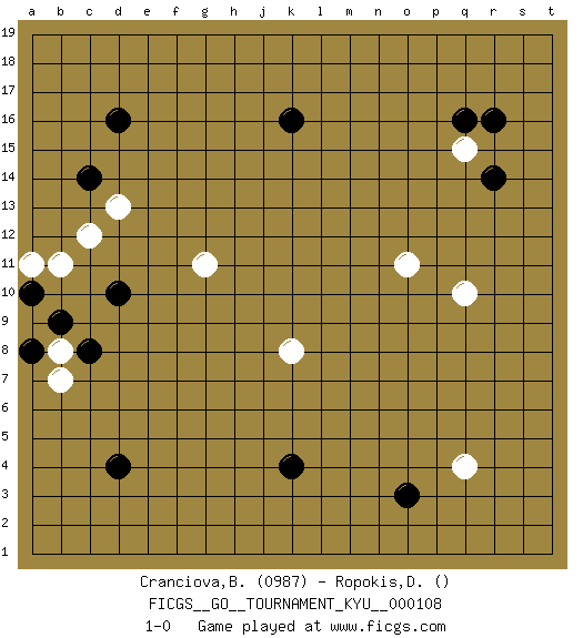 Last move : 1-0 2010 August 3 20:20:7 [Event "FICGS__GO__TOURNAMENT_KYU__000108 "] [Site "FICGS"] [Date "2010.07.22"] [Round "1"] [Black "Cranciova,Bogdan "] [White "Ropokis,Dimitrios "] [Result "1-0"] [Rating 1 "0987"] 1.q16 q4 2.d16 k8 3.d4 q10 4.d10 o11 5.k16 g11 6.k4 q15 7.r16 d13 8.c14 c12 9.o3 b11 10.b9 a11 11.r14 a9 12.a8 b7 13.c8 b8 14.a10 1-0 Here are the names of the openings (joseki) played in the four corners : Corner q16 : q16 o11Hoshi (Hwajeom, Seongjeom, Xingwei`) 4-4 Point. The star or hoshi (4-4) point, emphasizing influence at the potential expense of territory. Corner d16 : d16 g11Hoshi (Hwajeom, Seongjeom, Xingwei`) 4-4 Point. The star or hoshi (4-4) point, emphasizing influence at the potential expense of territory. Corner q4 : q4 o3Hoshi (Hwajeom, Seongjeom, Xingwei`) 4-4 Point. The star or hoshi (4-4) point, emphasizing influence at the potential expense of territory.Ikken Kakari (Hankan Keolch'im, Yi Gua`jiao~, 1-Space Low Approach). Black 2 is the standard approach move to the 4-4. Player Black won this Go (weiqi, baduk) game.Follow this game move after move (download ) Proverbs do not apply to White. (Tero Sand) SEO proverb : Make your website optimized for human beings, not for search engines.