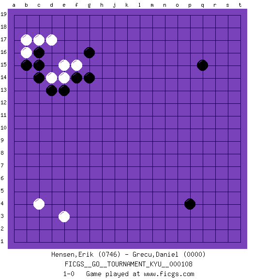Last move : 1-0 2010 July 29 20:13:13 [Event "FICGS__GO__TOURNAMENT_KYU__000108"] [Site "FICGS"] [Date "2010.07.22"] [Round "1"] [Black "Hensen,Erik"] [White "Grecu,Daniel"] [Result "1-0"] [Rating 1 "0746"] [Rating 2 "0000"] 1.q15 c4 2.p4 d17 3.g16 e3 4.c15 e15 5.f14 e14 6.e13 f15 7.g14 b16 8.c16 c17 9.b15 b17 10.d13 d14 11.c14 1-0 Here are the names of the openings (joseki) played in the four corners : Corner d16 : d17 g16 Komoku (Somok, Xiao~mu`) 3-4 Point. The komoku (3-4) point is the traditional corner enclosure move.. Player Black won this Go (weiqi, baduk) game. Follow this game move after move (download)If your stone is capped, play the knight's move. (Anonymous) Luck never gives; it only lends. (Swedish proverb)