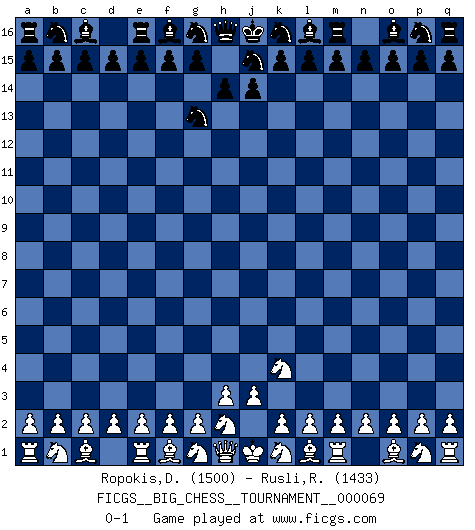 Last move : 0-1 2010 August 10 19:22:9 [Event "FICGS__BIG_CHESS__TOURNAMENT__000069"] [Site "FICGS"] [Date "2010.07.22"] [Round "1"] [White "Ropokis,Dimitrios"] [Black "Rusli,Rafnizar"] [Result "0-1"] [WhiteElo "1500"] [BlackElo "1433"] 1.j2-k4 h15-g13 0-1 Follow this game move after move (download)Chess problems demand from the composer the same virtues that characterize all worthwhile art: originality, invention, conciseness, harmony, complexity, and splendid insincerity. (Vladimir Nabokov) Wenn Du nicht kämpfst, um anderen etwas zu beweisen, sondern nur für Dich selbst, dann bist du fast unbesiegbar. (Garry Kasparov) El Ajedrez es una manera fabulosa para que los niños aprendan a autovalorarse y a autoestimarse. (Saudin Robovic) Même un GMI sait rarement calculer sur plus de cinq coups une attaque à sacrifices. (Rudolf Spielmann) Luck is when opportunity knocks and you answer. (Anonymous)
