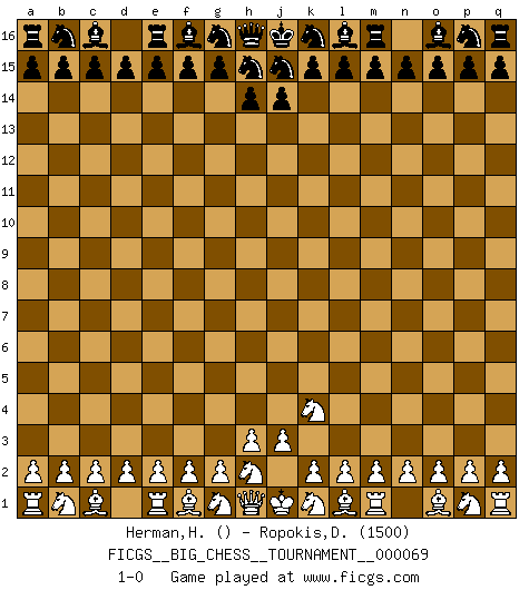 Last move : 1-0 2010 August 12 14:17:53 [Event "FICGS__BIG_CHESS__TOURNAMENT__000069"] [Site "FICGS"] [Date "2010.07.22"] [Round "1"] [White "Herman,Herdiansyah"] [Black "Ropokis,Dimitrios"] [Result "1-0"] [WhiteElo ""] [BlackElo "1500"] 1.j2-k4 1-0 Follow this game move after move (download)Why must I lose to this idiot ? (Aron Nimzovich) Mutter, ich bin eben Ex-Weltmeister geworden. --beim nach Hause Kommen nach dem Verlust des WM-Titels an Mihail Botvinnik -- (Mikhail Nekhemyevich Tal) En el Ajedrez, cuando menos, el valiente hereda la tierra. (Edmar Mednis) Psychologiquement, tu dois avoir confiance en toi même, mais cette confiance doit être basée sur des faits. (Robert Fischer) Ah, beer! The cause of, and the solution to, all of life's problems. (Homer Simpson)
