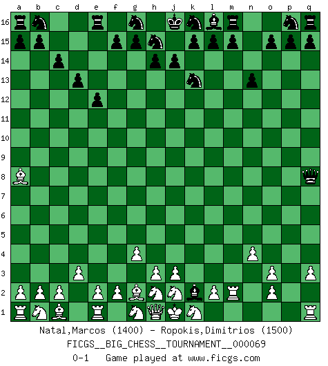 Last move : 0-1 2010 July 30 18:41:18 [Event "FICGS__BIG_CHESS__TOURNAMENT__000069"] [Site "FICGS"] [Date "2010.07.22"] [Round "1"] [White "Natal,Marcos"] [Black "Ropokis,Dimitrios"] [Result "0-1"] [WhiteElo "1400"] [BlackElo "1500"] 1.n2-n4 j15-k13 2.m2-m4 e15-e13 3.l1-n3 f16-c13 4.o1-b13 c15-c14 5.b13-d11 e13-e12 6.d11-a8 h16-q8 7.g2-g4 n15-n13 8.f1-g2 o16-g9 9.p1-o3 d15-d13 10.d2-d3 c16-p4 11.q2-q3 p4-o3 12.p2-o3 g9-m4 13.n3-m4 c13-m4 14.m1-m2 m4-k2 0-1 Follow this game move after move (download)Good positions don't win games, good moves do. (Gerald Abrahams) Ein guter Spieler hat immer Glück. (José Raúl Capablanca) El Ajedrez es una hermosa aventura. (Bent Larsen) En blitz, le Cavalier l'emporte sur le Fou. (Vlastimil Hort) Success without honor is an unseasoned dish; it will satisfy your hunger, but it won't taste good. (Joe Paterno)