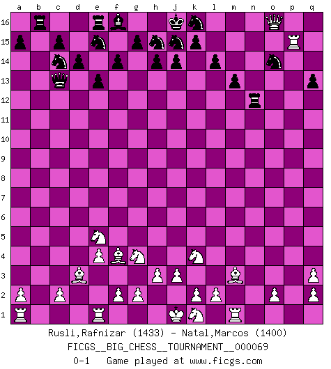 Last move : 0-1 2010 October 7 9:23:25 [Event "FICGS__BIG_CHESS__TOURNAMENT__000069"] [Site "FICGS"] [Date "2010.07.22"] [Round "1"] [White "Rusli,Rafnizar"] [Black "Natal,Marcos"] [Result "0-1"] [WhiteElo "1433"] [BlackElo "1400"] 1.j2-k4 b16-c14 2.h1-o7 j15-g14 3.o7-o15 p16-o14 4.o15-f7 f15-f14 5.m2-m4 l15-l14 6.d2-d4 m15-m13 7.e2-e4 n15-n13 8.n2-n4 l16-n14 9.h2-g4 q15-q13 10.p1-q3 d15-d14 11.g1-f3 c16-q3 12.p2-q3 h16-l13 13.f7-b11 e15-e14 14.b11-b15 g16-e15 15.b15-b6 o16-n15 16.b6-n6 e14-e13 17.n6-n13 l13-d6 18.f3-e5 d6-d4 19.n13-n14 m16-m15 20.b1-c3 n15-b4 21.c1-f4 b4-c3 22.b2-c3 d4-c3 23.f1-d3 q16-n16 24.n14-q11 a16-b16 25.l1-o4 n16-n4 26.o4-n5 m15-n15 27.o1-m3 n4-n5 28.m4-n5 n15-n5 29.q1-p1 n5-n15 30.q11-l16 g14-j15 31.l16-o16 n15-n12 32.p1-p15 c3-c13 0-1 This big chess game has been lost on time (started : 2010.07.22 18:59:17) Follow this game move after move (download)Chess mastery essentially consists of analyzing Chess positions accurately. (Mikhail Botvinnik) Man kann eine Schachpartie nur gewinnen, wenn das Gleichgewicht gestört ist. In einer Stellung mit ungestörtem Gleichgewicht ist auch das größte Genie hilflos - in der Stellung steckt dann eben kein genialer Einfall. (Wilhelm Steinitz) Yo siempre he tenido un ligero sentimiento de lástima por una persona que no tiene conocimiento del Ajedrez. (Siegbert Tarrasch) J'apprécie les joueurs d'est-indienne, c'est grâce à eux que je nourris ma famille depuis tant d'années. (Petrosian) Never risk one's whole fortune unless supported by one's entire army. (Niccolo Machiavelli)