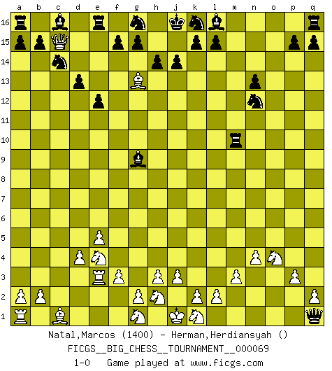 Last move : 1-0 2010 October 9 9:31:15 [Event "FICGS__BIG_CHESS__TOURNAMENT__000069"] [Site "FICGS"] [Date "2010.07.22"] [Round "1"] [White "Natal,Marcos"] [Black "Herman,Herdiansyah"] [Result "1-0"] [WhiteElo "1400"] [BlackElo ""] 1.n2-n4 j15-k13 2.o1-l4 h16-n11 3.m1-n1 n11-o10 4.j2-g3 o10-o2 5.n1-n2 o2-f10 6.f2-f3 f10-c10 7.l4-k3 c10-c2 8.b1-c3 c2-h7 9.m2-m3 e15-e13 10.e2-e4 n15-n13 11.f1-d3 m15-m13 12.e4-e5 h7-d3 13.n2-o2 d15-d13 14.e1-e3 d3-k9 15.d2-d4 k9-g9 16.o2-o15 g9-g3 17.c3-e4 g3-p11 18.p2-p3 p16-o14 19.p1-n2 o16-g9 20.k3-e8 p11-p14 21.e8-k13 p14-o15 22.k13-g10 e13-e12 23.h1-m5 o14-n12 24.g10-h9 f16-b12 25.h9-m13 m16-m13 26.m5-n5 m13-m12 27.n5-c15 o15-o3 28.n2-o4 o3-q1 29.l1-m2 h15-g13 30.m2-b12 b16-c14 31.b12-d10 m12-m10 32.d10-g13 1-0 This big chess game has been lost on time (started : 2010.07.22 18:59:17) Follow this game move after move (download)Chess is the gymnasium of the mind. (Blaise Pascal) Habe Mut, dich deines eigenen Verstandes zu bedienen. (Immanuel Kant) El Ajedrez era la lengua materna de Capablanca. (Reti) La solitude du joueur d'Echecs à l'approche du mat est semblable à celle du condamné. (Francis Szpiner) Who needs drugs and alcohol if he can play Big Chess at FICGS ? (Heinz-Georg Lehnhoff)