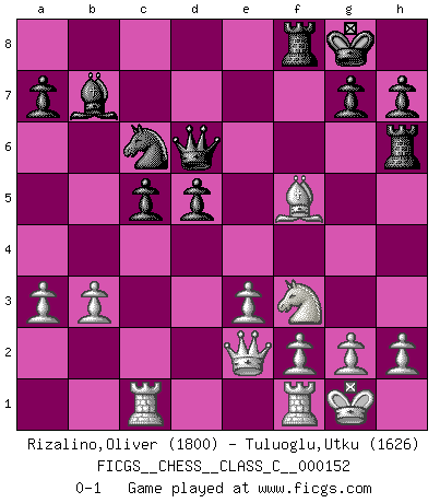Last move : 0-1 2010 October 29 10:32:55 [Event "FICGS__CHESS__CLASS_C__000152"] [Site "FICGS"] [Date "2010.07.24"] [Round "1"] [White "Rizalino,Oliver"] [Black "Tuluoglu,Utku"] [Result "0-1"] [WhiteElo "1800"] [BlackElo "1626"] 1.d4 f5 2.b3 Nf6 3.e3 e6 4.Bb2 Be7 5.Nh3 O-O 6.Bd3 d5 7.Nd2 c5 8.c4 Nc6 9.Rc1 b6 10.a3 Bb7 11.Nf4 Qd6 12.Nf3 Rac8 13.dxc5 bxc5 14.cxd5 Nxd5 15.Nxd5 exd5 16.O-O Bf6 17.Bxf6 Rxf6 18.Qe2 Rh6 19.Bxf5 Rf8 0-1 This chess game has been lost on time (started : 2010.07.24 12:49:42) Dutch Kingside Castling by player Black (move 5) Kingside Castling by player White (move 16) Player Black won this chess game. Follow this game move after move (download)A passed Pawn increases in strength as the number of pieces on the board diminishes. (Capablanca) Gott hat gewollt, dass ich Champion werde. (Surab Azmajparaschvili) Aquellos que dicen que entienden al Ajedrez, no entienden nada. (Robert Hubner) J'ai vu le vaincu d'Echecs jouer des années durant dans l'espoir de la fête de la victoire. Car tu es plus riche de ce qu'elle existe si même elle n'est point pour toi. Ainsi de la perle du fond des mers. (Antoine de Saint-Exupéry) Establishing goals is all right if you don't let them deprive you of interesting detours. (Doug Larson)