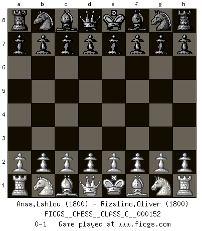 Last move : 0-1 2010 September 2 23:1:25 [Event "FICGS__CHESS__CLASS_C__000152"] [Site "FICGS"] [Date "2010.07.24"] [Round "1"] [White "Anas,Lahlou"] [Black "Rizalino,Oliver"] [Result "0-1"] [WhiteElo "1800"] [BlackElo "1800"] 0-1 This chess game has been lost on time (started : 2010.07.24 12:49:42) Player Black won this chess game. Follow this game move after move (download)You know you're going to lose. Even when I was ahead I knew I was going to lose. - On playing against Fischer. (Andrew Soltis) Mein Gehirn das ist mein zweitwichtigstes Organ [Aus dem Film: Der Schläfer]. (Woody Allen) Una victoria por una combinación errónea, aunque sea espectacular, me llena de horror artístico. (Wilhelm Steinitz) Même si vous avez un bon coup à faire, regardez toujours s'il n'y en a pas un qui lui soit préférable. (Pedro Damiano) Animated gif is worth one mega-word. (Unknown)