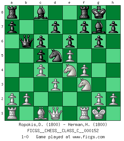Last move : 1-0 2010 October 13 9:47:43 [Event "FICGS__CHESS__CLASS_C__000152"] [Site "FICGS"] [Date "2010.07.24"] [Round "1"] [White "Ropokis,Dimitrios"] [Black "Herman,Herdiansyah"] [Result "1-0"] [WhiteElo "1800"] [BlackElo "1800"] 1.e4 c5 2.Nc3 Nc6 3.f4 g6 4.Nf3 Bg7 5.Bb5 e6 6.Bxc6 bxc6 7.O-O Ne7 8.e5 Nd5 9.Ne4 O-O 10.d3 Qb6 11.c4 1-0 This chess game has been lost on time (started : 2010.07.24 12:49:42) Sicilian : Grand Prix attack Kingside Castling by player White (move 7) Kingside Castling by player Black (move 9) Player White won this chess game. Follow this game move after move (download)My opponents make good moves too. Sometimes I don't take these things into consideration. (Bobby Fischer) Verschiedene, sehr schätzbare und im Laufe des Lebens nützliche Eigenschaften des Geistes können durch das Schachspiel erworben und gekräftigt werden, so dass sie zu Gewohnheiten werden, die uns nie im Stich lassen. (Benjamin Franklin) Un mal plan es mejor que no tener ningún plan. (Frank Marshall) L'attaque fait le spectacle, la défense gagne les matchs. (Dicton footballistique) There are more things in heaven and earth than practically anywhere else. (Unknown)