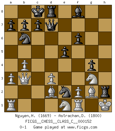 Last move : 0-1 2010 September 8 17:17:19 [Event "FICGS__CHESS__CLASS_C__000152"] [Site "FICGS"] [Date "2010.07.24"] [Round "1"] [White "Nguyen,Hao Nhien"] [Black "Astrachan,Daniel"] [Result "0-1"] [WhiteElo "1669"] [BlackElo "1800"] 1.c4 e5 2.Nc3 Nf6 3.d3 Nc6 4.Nf3 d5 5.cxd5 Nxd5 6.Bd2 f6 7.g3 Be6 8.Bg2 Qd7 9.O-O O-O-O 10.a3 g5 11.Qc2 g4 12.Ne1 Nd4 13.Qd1 Nb6 14.b4 h5 15.Ne4 Bb3 16.Qb1 Nxe2+ 17.Kh1 h4 18.Qxb3 hxg3 19.Nxg3 Rxh2+ 0-1 English Opening Kingside Castling by player White (move 9) Queenside Castling by player Black (move 9) Player Black won this chess game. Follow this game move after move (download)If a ruler does not understand Chess, how can he rule over a kingdom ? (King Khusros II) Pläne sind die Träume des Verständigen. (Ernst Freiherr von Feuchtersleben) Yo creo que el Ajedrez posee una magia que es también una ayuda en la edad avanzada. Una rodilla reumática es olvidada durante una partida de Ajedrez y otros eventos pueden parecer algo sin importancia comparada a una catástrofe en el tablero de Ajedrez. (Vlastimil Hort) D'abord les bases : Jouez et étudiez, puis étudiez et jouez, ensuite jouez et étudiez, puis étudiez et jouez. Deuxièmement : Donnez toujours le meilleur de vous-même ! (Ken Smith) Political correctness is subjecting us to gross incompetence. (Johann Piek)