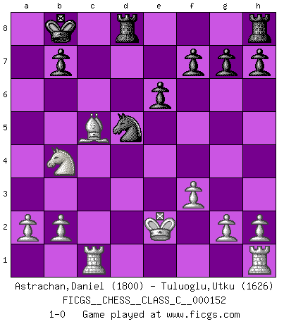 Last move : 1-0 2010 August 30 10:59:25 [Event "FICGS__CHESS__CLASS_C__000152"] [Site "FICGS"] [Date "2010.07.24"] [Round "1"] [White "Astrachan,Daniel"] [Black "Tuluoglu,Utku"] [Result "1-0"] [WhiteElo "1800"] [BlackElo "1626"] 1.d4 d5 2.c4 Nc6 3.Nf3 Bg4 4.Nc3 Nf6 5.cxd5 Nxd5 6.e4 Nf6 7.d5 Ne5 8.Nxe5 Bxd1 9.Bb5+ c6 10.dxc6 a6 11.c7 axb5 12.cxd8Q+ Rxd8 13.Nxd1 Nxe4 14.Be3 e6 15.Ke2 Bd6 16.Nd3 Ke7 17.f3 Nf6 18.Nc3 b4 19.Nb5 Nd5 20.Nxd6 Kxd6 21.Bc5+ Kc7 22.Rac1 Kb8 23.Nxb4 1-0 QGD : Chigorin defense Promotion Queen by player White (move 12) Player White won this chess game. Follow this game move after move (download)Half the variations which are calculated in a tournament game turn out to be completely superfluous. Unfortunately, no one knows in advance which half. (Jan Tinman) Über Karpov: Er war und ist ein Vertreter der russischen Reaktionäre. Das steckt tief in seiner Seele, wehalb ich nicht nett mit ihm umgehen kann. (Viktor Kortschnoi) Ayuda a tus piezas para que ellas te puedan ayudar. (Paul Morphy) Pour moi, les échecs ne sont pas un jeu mais un art. (Alexandre Alekhine) Wisdom is the reward you get for a lifetime of listening when you'd have preferred to talk. (Doug Larson)