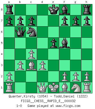 Last move : 1-0 2010 October 9 21:31:5 [Event "FICGS__CHESS__RAPID_E__000032"] [Site "FICGS"] [Date "2010.07.24"] [Round "1"] [White "Quanter,Kirsty"] [Black "Todd,Daniel"] [Result "1-0"] [WhiteElo "1054"] [BlackElo "1222"] 1.e4 Nf6 2.Nc3 d5 3.exd5 Nxd5 4.Nxd5 Qxd5 5.d3 e5 6.Be3 Nc6 7.c4 Qa5+ 8.Bd2 Qb6 9.b3 Bf5 10.Bc3 1-0 This chess game has been lost on time (started : 2010.07.24 19:13:5) Alekhine's defense : Scandinavian variation Player White won this chess game. Follow this game move after move (download)Chess, like love, is infectious at any age. (Flohr) Kostenjuk hat keinen Sexappeal. (Loek van Wely) El ganar no lo es todo... pero el perder es nada. (Mednis) Je menace de comprendre la position. (Anonyme) The good fighters of old first put themselves beyond the possibility of defeat, and then waited for an opportunity of defeating the enemy. (Sun Tzu)