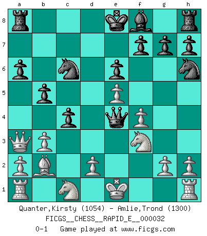 Last move : 0-1 2010 September 9 22:17:20 [Event "FICGS__CHESS__RAPID_E__000032"] [Site "FICGS"] [Date "2010.07.24"] [Round "1"] [White "Quanter,Kirsty"] [Black "Amlie,Trond"] [Result "0-1"] [WhiteElo "1054"] [BlackElo "1300"] 1.e4 c5 2.f4 d5 3.Nc3 d4 4.Bb5+ Bd7 5.Bxd7+ Qxd7 6.Nce2 d3 7.cxd3 Qxd3 8.Qa4+ Nc6 9.e5 Nh6 10.b3 a6 11.Nf3 b5 12.Qa3 e6 13.Bb2 c4 14.Nc1 Qe4+ 0-1 Sicilian : Grand Prix attack Player Black won this chess game. Follow this game move after move (download)There must have been a time when men were demigods, or they could not have invented Chess. (Gustav Schenk) Nicht daß Diemer aus Opportunismus Mitglied der NSDAP geworden wäre. Er war ein Fanatiker, in allem, was er tat. (Hans Ree) La mitad de las variaciones que son calculadas en una partida de torneo, resultan ser completamente superfluas. Desafortunadamente, nadie sabe por adelantado cual mitad. (Jan Tinman) Echiquier : carré parfait, comme la Jérusalem nouvelle décrite par l'auteur de l'Apocalypse, huit cases sur huit, exaltation du chiffre 4, symbole du cosmos aux quatre horizons... où le noir et le blanc, l'ombre et la lumière, le mal et le bien s'entremêlent et se conjuguent. (Robert Couffignal, Le Gambit du poète) Drag your thoughts away from your troubles... by the ears, by the heels, or any other way you can manage it. (Mark Twain)