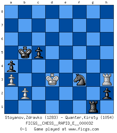 Last move : 0-1 2010 September 15 21:50:55 [Event "FICGS__CHESS__RAPID_E__000032"] [Site "FICGS"] [Date "2010.07.24"] [Round "1"] [White "Stoyanov,Zdravko"] [Black "Quanter,Kirsty"] [Result "0-1"] [WhiteElo "1283"] [BlackElo "1054"] 1.e4 e5 2.Nf3 Nc6 3.Bb5 a6 4.Bxc6 dxc6 5.h3 f5 6.exf5 e4 7.Ng1 Bxf5 8.Qh5+ g6 9.Qe2 b5 10.g4 Be6 11.Qxe4 Qe7 12.Ne2 Qd6 13.Nd4 Kd7 14.Nxe6 Qxe6 15.Qxe6+ Kxe6 16.a3 c5 17.d3 a5 18.Bf4 Bd6 19.Nd2 Bxf4 20.O-O-O a4 21.Kb1 Nf6 22.Rde1+ Kd5 23.c4+ Kd4 24.Nf3+ Kxd3 25.g5 Ne4 26.cxb5 Nxf2 27.Rhf1 Bg3 28.Re7 Nxh3 29.Rd1+ Kc4 30.Rh1 Nf2 31.Rg1 Bf4 32.Rg2 Nd3 33.Kc2 Rab8 34.Nd2+ Bxd2 35.Rxd2 Rbd8 36.Rxc7 h5 37.b6 Ne1+ 38.Kd1 Rxd2+ 39.Kxd2 Nf3+ 40.Kc2 Nxg5 41.Ra7 Kb5 42.Rg7 Nf3 43.Rxg6 h4 44.Rf6 h3 45.b7 h2 46.b8Q+ Rxb8 47.Rh6 Rg8 48.Kd3 Rg4 49.Rh3 Rg1 0-1 Ruy Lopez : Exchange variation Queenside Castling by player White (move 20) Promotion Queen by player White (move 46) 10 pieces endgame at move 46 : White KRPP , Black KRNPPP WHITE : King + 1 Rook 2 Pawns BLACK : King + 1 Rook 1 Knight 3 Pawns Player Black won this chess game. Follow this game move after move (download)In a gambit you give up a Pawn for the sake of getting a lost game. (Samuel Standige Boden) Viele Opfer benötigen überhaupt keine konkrete Berechnung. Es genügt sich die entstehende Position kurz vorzustellen, um uns davon zu überzeugen, dass das Opfer korrekt ist. (Mikhail Nekhemyevich Tal) Mi estilo es algo parecido entre un poco de Tal y Petrosian. (Reshevsky) Demandez au pauvre Cg1 ce qu'il en pense. Eduard Gufeld à propos de la variante Saemisch de l'Est-Indienne. At work, the authority of a person is inversely proportional to the number of pens that person is carrying. (Dan Rotaru)