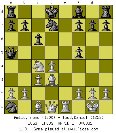 Last move : 1-0 2010 September 17 8:55:14 [Event "FICGS__CHESS__RAPID_E__000032"] [Site "FICGS"] [Date "2010.07.24"] [Round "1"] [White "Amlie,Trond"] [Black "Todd,Daniel"] [Result "1-0"] [WhiteElo "1300"] [BlackElo "1222"] 1.e4 Nf6 2.e5 Nd5 3.d4 d6 4.Nf3 dxe5 5.Nxe5 c6 6.Be2 Bf5 7.O-O Nd7 8.Nf3 Nb4 9.c3 Nc2 10.Nh4 Nxa1 11.Nxf5 Qa5 12.Bd3 e6 13.Na3 exf5 14.Re1+ Kd8 15.Nc4 1-0 This chess game has been lost on time (started : 2010.07.24 19:13:5) Alekhine's defense : Modern, Larsen variation Kingside Castling by player White (move 7) Player White won this chess game. Follow this game move after move (download)The beauty of a move lies not in its' appearance but in the thought behind it. (Siegbert Tarrasch) Rauchen ist dem Schachspieler bei seiner Arbeit, also im Wettkampf, untersagt. (Viktor Kortschnoi) La última cosa en que Fischer estaba interesado era en tonterías, siempre y cuando el Ajedrez estuviera involucrado. (Elie Agur) Dieu déplace le joueur, et celui-ci la pièce. Quel Dieu derrière Dieu commence donc la trame ? Arturo Perez-Reverte (prix de littérature policière 1993). A bird doesn't sing because it has an answer, it sings because it has a song. (Maya Angelou)