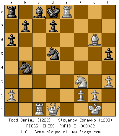 Last move : 1-0 2010 September 25 4:10:31 [Event "FICGS__CHESS__RAPID_E__000032"] [Site "FICGS"] [Date "2010.07.24"] [Round "1"] [White "Todd,Daniel"] [Black "Stoyanov,Zdravko"] [Result "1-0"] [WhiteElo "1222"] [BlackElo "1283"] 1.e4 c5 2.d4 cxd4 3.c3 dxc3 4.Nxc3 a6 5.Bc4 e6 6.Nf3 h6 7.O-O Bb4 8.Bf4 Qf6 9.Be5 Qe7 10.Bxg7 Rh7 11.Bd4 Nc6 12.Bb6 Bxc3 13.bxc3 Nf6 14.e5 Ng4 15.Re1 f6 16.exf6 Qxf6 17.h3 Qxc3 18.Bd3 h5 19.Bxh7 Nf6 20.Bg6+ Ke7 21.Rc1 Qb4 22.Bc5+ Kd8 23.Bxb4 Nxb4 24.Rxe6 Nfd5 25.Re8+ 1-0 Sicilian : Smith-Morra gambit Kingside Castling by player White (move 7) Player White won this chess game. Follow this game move after move (download)The tactician knows what to do when there is something to do; whereas the strategian knows what to do when there is nothing to do. (Gerald Abrahams) Schach verlangt totale Konzentration. (Robert James Fischer) Siempre es mejor sacrificar los hombres de tu oponente. (Savielly Tartakower) Celui qui prend des risques peut perdre, celui qui n'en prend pas perd toujours. (Xavier Tartacover) Whenever people agree with me, I always feel I must be wrong. (Oscar Wilde)