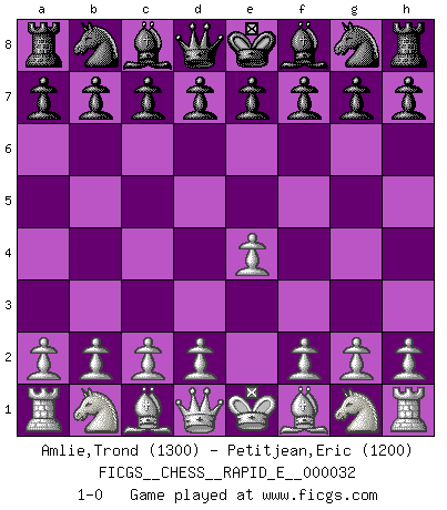 Last move : 1-0 2010 August 24 22:46:38 [Event "FICGS__CHESS__RAPID_E__000032"] [Site "FICGS"] [Date "2010.07.24"] [Round "1"] [White "Amlie,Trond"] [Black "Petitjean,Eric"] [Result "1-0"] [WhiteElo "1300"] [BlackElo "1200"] 1.e4 1-0 This chess game has been lost on time (started : 2010.07.24 19:13:5) King's pawn Opening Player White won this chess game. Follow this game move after move (download)It is difficult to play against Einstein's theory --on his first loss to Fischer. (Mikhail Tal) Wenn man heute mit 14 Jahren noch kein GM ist, kann man es vergessen. (Viswanathan Anand) Por esta medida (el intervalo entre Fischer y sus contemporaneos), yo le considero el mas grande campeón mundial. (Garry Kasparov) Ce qui caractérise les parties de combat, c'est que si le défenseur a constamment de difficiles problèmes à résoudre, l'attaquant doit chercher sans relâche de nouvelles possibilités d'attaque. (Koblentz) War is the child of passion, passion is the child of narcissism and narcissism is the child. (...) Another game ? (Thibault de Vassal)