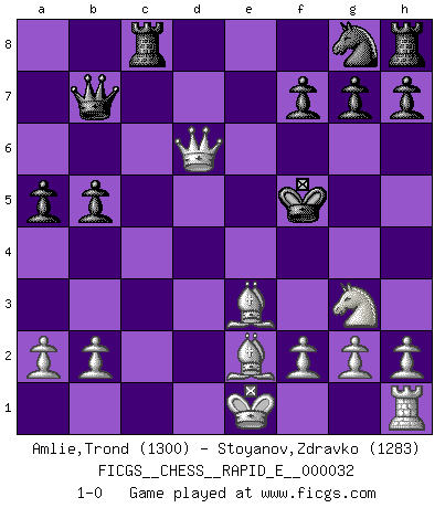 Last move : 1-0 2010 August 9 1:44:7 [Event "FICGS__CHESS__RAPID_E__000032"] [Site "FICGS"] [Date "2010.07.24"] [Round "1"] [White "Amlie,Trond"] [Black "Stoyanov,Zdravko"] [Result "1-0"] [WhiteElo "1300"] [BlackElo "1283"] 1.e4 c5 2.Nf3 a6 3.c3 Nc6 4.d4 cxd4 5.cxd4 d6 6.Be2 d5 7.exd5 Qxd5 8.Nc3 Qd8 9.d5 Nb4 10.Qa4+ Bd7 11.Qxb4 b5 12.Ne5 e6 13.d6 Qb6 14.Nxd7 Kxd7 15.Be3 Bxd6 16.Rd1 Qc6 17.Ne4 Ke7 18.Rxd6 a5 19.Qd4 Qb7 20.Qc5 Rc8 21.Rxe6+ Kxe6 22.Qd6+ Kf5 23.Ng3+ 1-0 Sicilian : O'Kelly variation Player White won this chess game. Follow this game move after move (download)Chess is in its essence a game, in its form an art, and in its execution a science. (Baron Tassilo) Jeder weiß, dass Gasprom Putins persönliches Machtinstrument ist. Die Firma wird vom Kreml aus geleitet und wird schon deshalb nie transparent sein. (Garry Kasparov) Mi estilo es algo parecido entre un poco de Tal y Petrosian. (Reshevsky) On croit qu'il y a plus de mauvais joueurs que de bons joueurs, c'est faux : Il y a autant de joueurs qui gagnent que de joueurs qui perdent. (Philippe Geluck) The ultimate in disposing one's troops is to be without ascertainable shape. Then the most penetrating spies cannot pry in nor can the wise lay plans against you. (Sun Tzu)