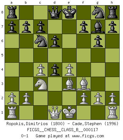 Last move : 0-1 2010 July 30 21:41:46 [Event "FICGS__CHESS__CLASS_B__000117"] [Site "FICGS"] [Date "2010.07.25"] [Round "1"] [White "Ropokis,Dimitrios"] [Black "Cade,Stephen"] [Result "0-1"] [WhiteElo "1800"] [BlackElo "1996"] 1.e4 g6 2.Nf3 Bg7 3.d4 d6 4.c4 Bg4 5.Be2 Nc6 6.Be3 e5 7.Nc3 Bxf3 8.Bxf3 exd4 0-1 Robatsch (Modern) defense Player Black won this chess game. Follow this game move after move (download)You know you're going to lose. Even when I was ahead I knew I was going to lose. - On playing against Fischer. (Andrew Soltis) Warum muß ich gegen diesen IDIOTEN verlieren? (Aaron Nimzowitsch) La estratégia requiere pensar, la táctica requiere observación. (Max Euwe) Que feriez-vous si vous étiez en train de jouer aux échecs et que la fin du monde arrive ? Je continuerais à jouer. (Saint Borromée) CHESS, n. f. [echecs, Fr.] A nice and abstruse game, in which two sets of puppets are moved in opposition to each other. (Dr Samuel Johnson, A Dictionary Of The English Language, 1755)