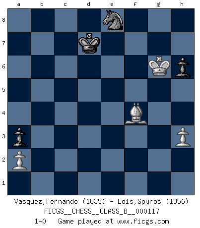 Last move : 1-0 2011 May 11 8:19:41 [Event "FICGS__CHESS__CLASS_B__000117"] [Site "FICGS"] [Date "2010.07.25"] [Round "1"] [White "Vasquez,Fernando"] [Black "Lois,Spyros"] [Result "1-0"] [WhiteElo "1835"] [BlackElo "1956"] 1.e4 c5 2.d4 cxd4 3.c3 d5 4.Qf3 dxe4 5.Qxe4 Nc6 6.Bb5 Bd7 7.Nf3 Nf6 8.Qd3 e5 9.Bxc6 Bxc6 10.Nxe5 Bxg2 11.Qb5+ Nd7 12.Rg1 Be4 13.Nd2 Bf5 14.Nef3 dxc3 15.Qxf5 cxd2+ 16.Bxd2 g6 17.Qb5 Bg7 18.Qe2+ Qe7 19.Qxe7+ Kxe7 20.Bb4+ Kd8 21.Ng5 Re8+ 22.Kf1 Kc7 23.Rc1+ Kb6 24.Nxf7 a5 25.Ba3 Rac8 26.Rd1 Rc7 27.Nd6 Re6 28.Rg4 Nf6 29.Rc4 Rxc4 30.Nxc4+ Ka6 31.b3 Bh6 32.Rd8 b5 33.Nd6 Bf4 34.Bc5 Bxd6 35.Bxd6 Re8 36.Rxe8 Nxe8 37.Be5 a4 38.bxa4 bxa4 39.Ke2 Kb5 40.Kd3 Kb4 41.Kd4 Kb5 42.Kd5 g5 43.h3 a3 44.Ke6 Kc6 45.Bb8 h6 46.Ke7 Ng7 47.Kf6 Ne8+ 48.Kg6 Kd7 49.f4 gxf4 50.Bxf4 1-0 Sicilian : Smith-Morra gambit 10 pieces endgame at move 38 : White KBPPP , Black KNPPP WHITE : King + 1 Bishop 3 Pawns BLACK : King + 1 Knight 3 Pawns 9 pieces endgame at move 49 : White KBPP , Black KNPPP WHITE : King + 1 Bishop 2 Pawns BLACK : King + 1 Knight 3 Pawns 8 pieces endgame at move 50 : White KBPP , Black KNPP WHITE : King + 1 Bishop 2 Pawns BLACK : King + 1 Knight 2 Pawns Player White won this chess game. Follow this game move after move (download)Different people feel differently about resigning. (Bobby Fischer) Ohne ihre Erfolge schmälern zu wollen würde ich sagen Petrosian, Spassky und Karpov verdanken ihre Siege ihren Trainern - Boleslavsky, Bondarevsky und Furman. (Mikhail Moiseyevich Botvinik) Del Ajedrez se ha dicho que la vida no es lo suficientemente larga para él, pero eso es culpa de la vida, no del Ajedrez. (William Ewart Napier) Le système Elo représente seulement une moyenne. Il est simplement un indicateur de votre stabilité. (Anatoli Karpov) The good fighters of old first put themselves beyond the possibility of defeat, and then waited for an opportunity of defeating the enemy. (Sun Tzu)