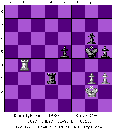 Last move : 1/2-1/2 2011 March 17 0:3:49 [Event "FICGS__CHESS__CLASS_B__000117"] [Site "FICGS"] [Date "2010.07.25"] [Round "1"] [White "Dumont,Freddy"] [Black "Lim,Steve"] [Result "1/2-1/2"] [WhiteElo "1928"] [BlackElo "1800"] 1.e4 e6 2.Qe2 c5 3.Nf3 Nc6 4.g3 Be7 5.Bg2 d5 6.d3 Nf6 7.O-O h6 8.Re1 O-O 9.e5 Nd7 10.c4 d4 11.Na3 a6 12.Nc2 Rb8 13.a4 Qc7 14.Bd2 b6 15.b4 cxb4 16.Nfxd4 Ndxe5 17.Rab1 Nxd4 18.Nxd4 Rd8 19.Bf4 Bd6 20.Bxe5 Bxe5 21.Qxe5 Qxe5 22.Rxe5 Rxd4 23.Rxb4 Rxd3 24.Rb1 Rc3 25.a5 b5 26.cxb5 f6 27.R5e1 Rxb5 28.Rxb5 axb5 29.f4 Kf7 30.Rb1 Ba6 31.Bf1 Ra3 32.Bxb5 Rxa5 33.Bxa6 Rxa6 34.Rb7+ Kg6 35.h3 e5 36.fxe5 fxe5 37.Kf2 Ra2+ 38.Kf3 Ra3+ 39.Kf2 h5 40.Rb8 Rc3 41.Rb7 Kf6 42.Rb6+ Kg5 43.Rb4 Rd3 44.Kg2 g6 1/2-1/2 French : Chigorin variation Kingside Castling by player White (move 7) Kingside Castling by player Black (move 8) 10 pieces endgame at move 36 : White KRPPP , Black KRPPP WHITE : King + 1 Rook 3 Pawns BLACK : King + 1 Rook 3 Pawns 9 pieces endgame at move 36 : White KRPP , Black KRPPP WHITE : King + 1 Rook 2 Pawns BLACK : King + 1 Rook 3 Pawns This chess game ended in a draw. Follow this game move after move (download)Even the laziest King flees wildly in the face of a double check ! (Aaron Nimzowitsch) Im Hotelzimmer gab es nur zwei Schaben. (Über die Turnierbedingungen) (Peter Swidler) Vive, pierde y aprende al observar a tu oponente como gana. (Amber Steenbock) Ce n'est pas pour s'amuser qu'il joue aux échecs : il célèbre un culte. (Vladimir Nabokov) How many people work in NATO Headquarters ? - About half of them. (Dirk Stikker, NATO general secretary)