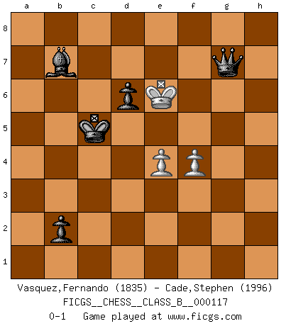 Last move : 0-1 2011 June 16 3:47:31 [Event "FICGS__CHESS__CLASS_B__000117"] [Site "FICGS"] [Date "2010.07.25"] [Round "1"] [White "Vasquez,Fernando"] [Black "Cade,Stephen"] [Result "0-1"] [WhiteElo "1835"] [BlackElo "1996"] 1.e4 g6 2.d4 Bg7 3.Nc3 d6 4.Be2 a6 5.Nf3 e6 6.Bg5 Ne7 7.Qd2 h6 8.Be3 Nd7 9.O-O b6 10.Rad1 Bb7 11.d5 e5 12.Ne1 f5 13.f3 Nf6 14.a4 g5 15.Bc4 f4 16.Bf2 g4 17.Be2 h5 18.Nd3 Qd7 19.a5 b5 20.Ra1 Ng6 21.Qd1 O-O-O 22.Kh1 g3 23.hxg3 fxg3 24.Bxg3 h4 25.Bf2 Nh5 26.Kh2 Ngf4 27.Nxf4 Nxf4 28.Bxb5 axb5 29.a6 Ba8 30.Ne2 Rdg8 31.Nxf4 exf4 32.Rg1 Be5 33.Qe2 h3 34.g4 fxg3+ 35.Bxg3 Bxg3+ 36.Rxg3 Rxg3 37.Kxg3 Rg8+ 38.Kh2 Rg2+ 39.Qxg2 hxg2 40.Rg1 Qf7 41.Kxg2 Qf6 42.c3 Qg5+ 43.Kh2 Qf4+ 44.Kg2 Kb8 45.Rd1 Ka7 46.Rd4 Kxa6 47.Rd1 Qe3 48.Kg3 Kb6 49.Kg4 Qe2 50.Rb1 Bb7 51.b3 Qc2 52.Ra1 Qxb3 53.c4 Qb2 54.c5+ dxc5 55.Rd1 Qe5 56.Kh3 c4 57.Re1 c3 58.Rg1 c2 59.Kg2 Qg5+ 60.Kh2 Qxg1+ 61.Kxg1 c1Q+ 62.Kg2 b4 63.d6 cxd6 64.Kg3 b3 65.Kg4 b2 66.f4 Qg1+ 67.Kf5 Qg7 68.Ke6 Kc5 0-1 Robatsch (Modern) defense Kingside Castling by player White (move 9) Queenside Castling by player Black (move 21) 10 pieces endgame at move 60 : White KPPP , Black KQBPPP WHITE : King + 3 Pawns BLACK : King + 1 Queen 1 Bishop 3 Pawns 9 pieces endgame at move 61 : White KPPP , Black KBPPP WHITE : King + 3 Pawns BLACK : King + 1 Bishop 3 Pawns Promotion Queen by player Black (move 61) 8 pieces endgame at move 63 : White KPP , Black KQBPP WHITE : King + 2 Pawns BLACK : King + 1 Queen 1 Bishop 2 Pawns Player Black won this chess game. Follow this game move after move (download)Dazzling combinations are for the many, shifting wood is for the few. (Georg Kieninger) Wer wird heute Abend ihr Gegner sein? -- Heute Abend spiele ich gegen die schwarzen Steine. (Akiba Rubinstein) El Ajedrez se juega con la mente... ¡no con las manos!. (Renaud y Kahn) Des combinaisons [dans le jeu d'échecs] pareilles à des mélodies. Je crois entendre pour ainsi dire la musique des coups... (Vladimir Nabokov) Big Chess is a place for big hallucinations. (Thibault de Vassal)