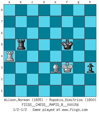 Last move : 1/2-1/2 2010 September 23 9:43:36 [Event "FICGS__CHESS__RAPID_B__000156"] [Site "FICGS"] [Date "2010.07.26"] [Round "1"] [White "Wilson,Norman"] [Black "Ropokis,Dimitrios"] [Result "1/2-1/2"] [WhiteElo "1835"] [BlackElo "1800"] 1.e4 c6 2.d4 d5 3.Nc3 dxe4 4.Nxe4 Nf6 5.Nxf6+ exf6 6.Nf3 Bf5 7.Bd3 Bxd3 8.Qxd3 Bd6 9.O-O O-O 10.Bd2 Na6 11.Rfe1 Nc7 12.g3 Qd7 13.Kg2 Rfe8 14.Rxe8+ Rxe8 15.c4 b6 16.h3 g6 17.Rd1 Bf8 18.Bc3 Bg7 19.Qc2 Ra8 20.Qb3 Re8 21.Qa4 a6 22.Qc2 Ne6 23.Qb3 Qb7 24.Ba5 Rb8 25.Bd2 f5 26.Be3 b5 27.d5 cxd5 28.cxd5 Nc7 29.d6 Ne6 30.d7 Rd8 31.Qd5 Qxd5 32.Rxd5 Nf8 33.Ne5 Bxe5 34.Rxe5 Kg7 35.Re8 Rxd7 36.Ra8 Ne6 37.Rxa6 g5 38.Ra5 Rb7 39.h4 gxh4 40.gxh4 Kg6 41.Kg3 Rb8 42.f4 Rb7 43.Kf3 Kh5 44.a4 bxa4 45.Rxf5+ Kg6 46.Ra5 f5 47.h5+ Kxh5 48.Rxf5+ Kg6 49.Ra5 Rxb2 50.f5+ Kf6 51.fxe6 Kxe6 52.Rxa4 Rb5 53.Ra6+ Kf5 54.Ra7 h5 55.Ra6 h4 56.Ra4 h3 1/2-1/2 Caro-Kann : Tartakower (Nimzovich) variation Kingside Castling by player White (move 9) Kingside Castling by player Black (move 9) 10 pieces endgame at move 48 : White KRBPP , Black KRNPP WHITE : King + 1 Rook 1 Bishop 2 Pawns BLACK : King + 1 Rook 1 Knight 2 Pawns 9 pieces endgame at move 49 : White KRBP , Black KRNPP WHITE : King + 1 Rook 1 Bishop 1 Pawn BLACK : King + 1 Rook 1 Knight 2 Pawns 8 pieces endgame at move 51 : White KRBP , Black KRPP WHITE : King + 1 Rook 1 Bishop 1 Pawn BLACK : King + 1 Rook 2 Pawns 7 pieces endgame at move 51 : White KRB , Black KRPP WHITE : King + 1 Rook 1 Bishop BLACK : King + 1 Rook 2 Pawns 6 pieces endgame at move 52 : White KRB , Black KRP WHITE : King + 1 Rook 1 Bishop BLACK : King + 1 Rook 1 Pawn This chess game ended in a draw. Follow this game move after move (download)I like to say that Bobby Fischer was the greatest player ever. But what made Fischer a genius was his ability to blend an American freshness and pragmatism with Russian ideas about strategy. (Bruce Pandolfini) Spiel ein langweiliges Spiel zu Ende und lustige Dinge können passieren. (Hans Ree) Si yo gano un torneo, yo lo gano por mí mismo. Yo hago las jugadas. Nadie me ayuda. (Bobby Fischer) Vous m'avez demandé de vous exposer quel est le fondement de la prière. Je ne fais que préparer les pièces du jeu sur la table... Nous sera-t-il permis d'en adopter les règles et si nous les appliquons scrupuleusement nous ne tarderons pas à faire mat le Roi divin ! Il ne pourra échapper à nos mains. (Sainte Thérèse d'Avila, Chemin de perfection) 98% of all statistics are made up. (Author unknown)