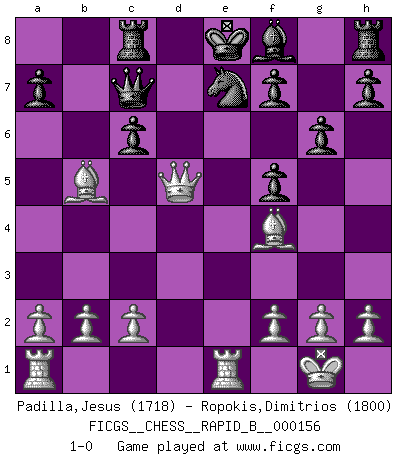 Last move : 1-0 2010 August 8 9:33:35 [Event "FICGS__CHESS__RAPID_B__000156"] [Site "FICGS"] [Date "2010.07.26"] [Round "1"] [White "Padilla,Jesus"] [Black "Ropokis,Dimitrios"] [Result "1-0"] [WhiteElo "1718"] [BlackElo "1800"] 1.e4 c6 2.d4 d5 3.e5 Bf5 4.Nf3 e6 5.Be2 Ne7 6.O-O Nd7 7.Nbd2 Qc7 8.Nh4 c5 9.Nb3 cxd4 10.Nxd4 Nxe5 11.Nhxf5 exf5 12.Bb5+ N5c6 13.Re1 g6 14.Nxc6 bxc6 15.Qxd5 Rc8 16.Bf4 1-0 Caro-Kann : Advance variation Kingside Castling by player White (move 6) Player White won this chess game. Follow this game move after move (download)Some part of a mistake is always correct. (Savielly Tartakover) Jede Eröffnung ist gut genug um gespielt zu werden, wenn nur ihr Ruf schlecht genug ist. (Savielly Grigorievitsch Tartakower) ¿Cual es el objetivo de jugar una apertura de gambito?... Para adquirir una reputación de ser un jugador apuesto a costo de perder el juego. (Siegbert Tarrasch) RxDa4 pat (...) He who fights with monsters should be careful lest he thereby become a monster. (Friedrich Nietzsche, Beyond Good and Evil)