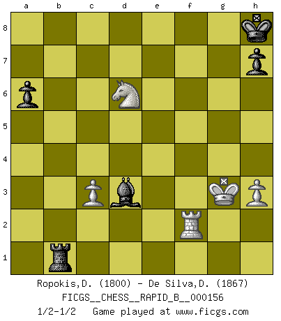 Last move : 1/2-1/2 2010 October 9 3:32:23 [Event "FICGS__CHESS__RAPID_B__000156"] [Site "FICGS"] [Date "2010.07.26"] [Round "1"] [White "Ropokis,Dimitrios"] [Black "De Silva,Dinesh"] [Result "1/2-1/2"] [WhiteElo "1800"] [BlackElo "1867"] 1.e4 c5 2.f4 g6 3.Nc3 Bg7 4.Nf3 Nc6 5.Bb5 Nd4 6.O-O Nxb5 7.Nxb5 a6 8.Nc3 b5 9.d3 Bb7 10.Qe2 d6 11.a3 Nh6 12.h3 O-O 13.g4 f5 14.exf5 gxf5 15.Qe6+ Kh8 16.g5 Nf7 17.Bd2 Bc8 18.Qd5 Rb8 19.Rae1 b4 20.axb4 cxb4 21.Ne2 Rb5 22.Qa2 b3 23.cxb3 Qb6+ 24.Rf2 e5 25.b4 Bb7 26.Nh4 Bd5 27.Qa3 exf4 28.g6 f3 29.gxf7 fxe2 30.R1xe2 Bxf7 31.Be3 Bd4 32.Bxd4+ Qxd4 33.Qc3 Rxb4 34.Nxf5 Qxc3 35.bxc3 Rb1+ 36.Kh2 Bg6 37.Nxd6 Rxf2+ 38.Rxf2 Bxd3 39.Kg3 1/2-1/2 Sicilian : Grand Prix attack Kingside Castling by player White (move 6) Kingside Castling by player Black (move 12) 10 pieces endgame at move 38 : White KRNPP , Black KRBPP WHITE : King + 1 Rook 1 Knight 2 Pawns BLACK : King + 1 Rook 1 Bishop 2 Pawns This chess game ended in a draw. Follow this game move after move (download)If your opponent cannot do anything active, then don't rush the position; instead you should let him sit there, suffer, and beg you for a draw. (Jeremy Silman) Ich bin der einzige Schachspieler, der sich während der Vorbereitungen zum Turnier verletzt hat. (Woody Allen) El Ajedrez es el juego mas altamente simbólico, pero las agresiones estan por lo tanto aún mas francamente representadas en la partida. Tal vez comenzo como un juego de guerra; Algo como la representación de una batalla en miniatura entre las fuerzas de dos reinos. (Karl Meninger) Pour se monter efficace, un Cavalier a besoin d'avant-postes ! Les Cavaliers font les meilleurs bloqueurs de pions passés. The human is the only animal species whose members are able to talk themselves into difficulties that would not otherwise exist. (Wendell Johnson)