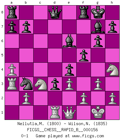 Last move : 0-1 2010 September 1 8:42:13 [Event "FICGS__CHESS__RAPID_B__000156"] [Site "FICGS"] [Date "2010.07.26"] [Round "1"] [White "Nellutla,Manobhiram"] [Black "Wilson,Norman"] [Result "0-1"] [WhiteElo "1800"] [BlackElo "1835"] 1.d4 Nf6 2.e3 g6 3.Nf3 Bg7 4.a3 O-O 5.Bd3 d5 6.O-O c5 7.dxc5 Nfd7 8.Nh4 e5 9.g3 Nxc5 10.a4 Nc6 11.c4 Be6 12.Nc3 dxc4 13.Be4 Nb4 14.Qe2 Nbd3 15.Rd1 f5 16.Bxd3 cxd3 17.Qe1 Nb3 18.Ra3 Nxc1 19.Rd2 Nb3 20.Rd1 e4 0-1 Queen's pawn game Kingside Castling by player Black (move 4) Kingside Castling by player White (move 6) Player Black won this chess game. Follow this game move after move (download)The beauty of a move lies not in its' appearance but in the thought behind it. (Siegbert Tarrasch) Auf jeden Fall musst du zuerst Rechtsanwalt werden, damit du deine eigenen Interessen und die deiner Familie vertreten kannst. [Brief an seinen Sohn] (José Raúl Capablanca) Si no le temes a Spassky, entonces elimino el elemento del dinero. (Jim Slater) Seul un grand joueur sait à quel point il joue faiblement. (Xavier Tartacover) No enterprise is more likely to succeed than one concealed from the enemy until it is ripe for execution. (Niccolo Machiavelli)