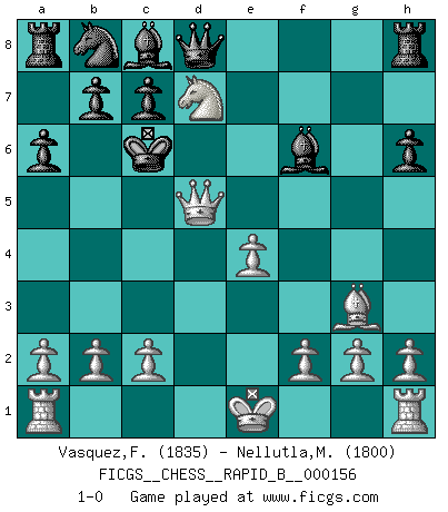 Last move : 1-0 2010 September 16 1:52:52 [Event "FICGS__CHESS__RAPID_B__000156"] [Site "FICGS"] [Date "2010.07.26"] [Round "1"] [White "Vasquez,Fernando"] [Black "Nellutla,Manobhiram"] [Result "1-0"] [WhiteElo "1835"] [BlackElo "1800"] 1.e4 e5 2.Nf3 d6 3.d4 Qf6 4.Bg5 Qe6 5.Nc3 h6 6.Nd5 Qd7 7.Bh4 Be7 8.dxe5 a6 9.Bg3 dxe5 10.Nxe5 Qd8 11.Bc4 Nf6 12.Nxf6+ Bxf6 13.Qh5 g6 14.Bxf7+ Kf8 15.Nxg6+ Kxf7 16.Ne5+ Ke6 17.Qf7+ Kd6 18.Nd7 Kc6 19.Qd5+ 1-0 Philidor's defense Player White won this chess game. Follow this game move after move (download)The tactician knows what to do when there is something to do; whereas the strategian knows what to do when there is nothing to do. (Gerald Abrahams) Schach verlangt totale Konzentration. (Robert James Fischer) Un sacrificio se refuta mucho mejor al aceptarlo. (Wilhelm Steinitz) Les Echecs ont trois composantes : le temps, l'espace et le matériel en dernier. (Mikhail Tal) Convictions are more dangerous enemies of truth than lies. (Friedrich Nietzsche)