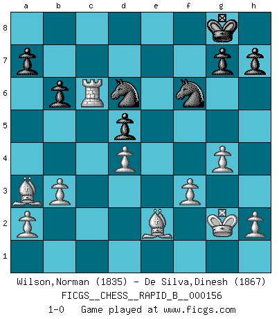 Last move : 1-0 2010 October 22 9:43:57 [Event "FICGS__CHESS__RAPID_B__000156"] [Site "FICGS"] [Date "2010.07.26"] [Round "1"] [White "Wilson,Norman"] [Black "De Silva,Dinesh"] [Result "1-0"] [WhiteElo "1835"] [BlackElo "1867"] 1.e4 e5 2.Nf3 f5 3.Nxe5 Qf6 4.Nc4 fxe4 5.Nc3 Qf7 6.Ne3 c6 7.Bc4 d5 8.Bb3 Nf6 9.O-O Bc5 10.d3 exd3 11.cxd3 O-O 12.Ne4 Na6 13.Nxc5 Nxc5 14.Bc2 Be6 15.d4 Nce4 16.b3 Qd7 17.f3 Nd6 18.g4 Rae8 19.Ba3 b6 20.Bd3 Rc8 21.Rc1 Rf7 22.Ng2 Nb5 23.Bb2 R7f8 24.Re1 Nd6 25.Nf4 Bf7 26.Ba6 Rce8 27.Nd3 Rxe1+ 28.Qxe1 Qc7 29.Qc3 Be8 30.Ba3 Bd7 31.Ne5 Re8 32.Nxc6 Bxc6 33.Qxc6 Re1+ 34.Kg2 Qxc6 35.Rxc6 Re2+ 36.Bxe2 1-0 Latvian counter-gambit Kingside Castling by player White (move 9) Kingside Castling by player Black (move 11) Player White won this chess game. Follow this game move after move (download)It is difficult to play against Einstein's theory --on his first loss to Fischer. (Mikhail Tal) Wenn man heute mit 14 Jahren noch kein GM ist, kann man es vergessen. (Viswanathan Anand) Por la belleza de sus partidas, la claridad de su juego y lo brillante de sus ideas, Fischer se creó el mismo como un artista de la misma estatura como Brahms, Rembrandt y Shakespeare. (David Levy) Ce n'est pas pour s'amuser qu'il joue aux échecs : il célèbre un culte. (Vladimir Nabokov) At last I discovered the true beauty of chess. So I proposed to her. (Dinesh De Silva)