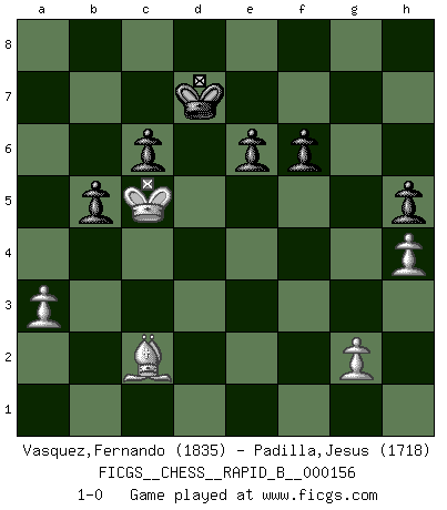 Last move : 1-0 2010 November 21 15:30:39 [Event "FICGS__CHESS__RAPID_B__000156"] [Site "FICGS"] [Date "2010.07.26"] [Round "1"] [White "Vasquez,Fernando"] [Black "Padilla,Jesus"] [Result "1-0"] [WhiteElo "1835"] [BlackElo "1718"] 1.e4 c5 2.d4 cxd4 3.c3 dxc3 4.Nxc3 Nc6 5.Nf3 e6 6.Bc4 Bb4 7.O-O a6 8.a3 Bxc3 9.bxc3 Nf6 10.Re1 Qa5 11.Bf4 Qxc3 12.Bb3 O-O 13.Bd6 Rd8 14.Bc7 Re8 15.e5 Ng4 16.Re4 Nxf2 17.Kxf2 Na5 18.Bxa5 Qxa5 19.Rh4 Qc5+ 20.Qd4 Qxd4+ 21.Rxd4 Rb8 22.Rc1 Rd8 23.Rc7 b5 24.Ng5 h6 25.Ne4 Bb7 26.Nc5 Bc6 27.Nxa6 Ra8 28.Nb4 Rdc8 29.Rxc8+ Rxc8 30.Bc2 Kf8 31.Rd6 Ke7 32.Nxc6+ Rxc6 33.Rxc6 dxc6 34.Ke3 f6 35.Kd4 h5 36.exf6+ gxf6 37.Kc5 Kd7 38.h4 1-0 Sicilian : Smith-Morra gambit Kingside Castling by player White (move 7) Kingside Castling by player Black (move 12) Player White won this chess game. Follow this game move after move (download)Only sissies Castle. (Rob Sillars) Du weisst es gibt ein Problem mit Computern und Fernschach, wenn jeder eine Rating von 2450 hat. (John Christen Knudsen) Diferente gente reacciona diferentemente en aceptar la derrota. (Bobby Fischer) C'est une question de caractère, Beaucoup de gens perdent leur motivation très vite. D'autres, ils sont rares, peuvent la conserver très longtemps. J'aime les échecs, encore aujourd'hui je suis heureux d'analyser des parties. J'aime toujours gagner, je déteste encore perdre. Bien jouer est important pour mon intégrité intellectuelle et morale. Et puis les échecs vivent en ce moment une période historique grâce à Internet. Ils se développent dans les systèmes éducatifs à travers le monde. Ils sortent de leur ghetto, et c'est mon rôle de mener à bien cette révolution. (Gary Kasparov) The project of the man are lower than those of the sky. (Chinese proverb)
