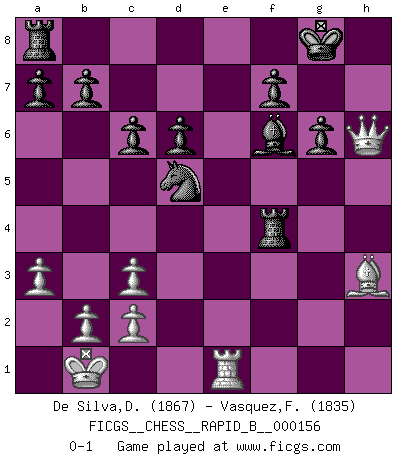 Last move : 0-1 2010 November 26 22:44:49 [Event "FICGS__CHESS__RAPID_B__000156"] [Site "FICGS"] [Date "2010.07.26"] [Round "1"] [White "De Silva,Dinesh"] [Black "Vasquez,Fernando"] [Result "0-1"] [WhiteElo "1867"] [BlackElo "1835"] 1.e4 e5 2.Nf3 Nf6 3.Nxe5 d6 4.Nf3 Nxe4 5.Nc3 Nxc3 6.dxc3 Be7 7.Bf4 O-O 8.Qd2 Nd7 9.O-O-O Nc5 10.Be3 Be6 11.Kb1 Re8 12.h4 h6 13.Nd4 Ne4 14.Qe1 Bxh4 15.Nxe6 Rxe6 16.Bc4 Re8 17.Qg1 Qe7 18.Bd5 Bf6 19.g4 Nc5 20.Bc1 c6 21.Bg2 Qe6 22.Qh2 Qxg4 23.Rdg1 Qf5 24.Bxh6 Re2 25.Bd2 g6 26.Qh7+ Kf8 27.Bh3 Qd5 28.Bf4 Ne6 29.Rd1 Nxf4 30.Rxd5 Nxd5 31.a3 Rxf2 32.Re1 Rf4 33.Qh6+ Kg8 0-1 This chess game has been lost on time (started : 2010.07.26 15:25:30) Petrov : Nimzovich attack Kingside Castling by player Black (move 7) Queenside Castling by player White (move 9) Player Black won this chess game. Follow this game move after move (download)Later, I began to succeed in decisive games. Perhaps because I realized a very simple truth: not only was I worried, but also my opponent. (Mikhail Tal) Immer nach dem besten Zug zu suchen ist ziemlich unpraktisch. (Nigel Short) ¿Que sería del Ajedrez sin errores graciosos?. (Kurt Richter) La victoire dans une partie d'Echecs appartient la plupart du temps à celui qui voit un peu plus loin que l'adversaire. (Lasker) You lose, general Kenobi. (General Grievous in Star Wars ep.3)