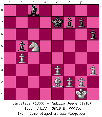 Last move : 1-0 2010 October 2 16:6:1 [Event "FICGS__CHESS__RAPID_B__000156"] [Site "FICGS"] [Date "2010.07.26"] [Round "1"] [White "Lim,Steve"] [Black "Padilla,Jesus"] [Result "1-0"] [WhiteElo "1800"] [BlackElo "1718"] 1.d4 Nf6 2.c4 e6 3.Nc3 d5 4.Nf3 Be7 5.Bf4 O-O 6.e3 c5 7.dxc5 Bxc5 8.cxd5 exd5 9.Be2 Nc6 10.O-O Be6 11.Rc1 Rc8 12.h3 h6 13.a3 a6 14.Qa4 Qe7 15.Rfd1 Rfe8 16.Bd3 Bd7 17.Qc2 Bd6 18.Bxd6 Qxd6 19.Bc4 Ne7 20.Be2 Nc6 21.Rd2 Na5 22.Qd1 Nb3 23.Qxb3 b5 24.Qb4 Qxb4 25.axb4 Rc6 26.Rcd1 Be6 27.Nd4 Rc7 28.Ra1 Bc8 29.Bf3 Rd8 30.Nb3 Kf8 31.Nc5 Rc6 32.Rad1 a5 33.Nxd5 axb4 34.Nxb4 Rxd2 35.Nxc6 Rxd1+ 36.Bxd1 Nd5 37.Be2 Ne7 38.Nxe7 Kxe7 39.b4 1-0 Queen's pawn game Kingside Castling by player Black (move 5) Kingside Castling by player White (move 10) Player White won this chess game. Follow this game move after move (download)Chess holds its master in its own bonds, shackling the mind and brain so that the inner freedom of the very strongest must suffer. (Albert Einstein) Rubinstein ist ein Turmendspiel, welches die Götter vor tausenden von Jahren begannen. (Savielly Grigorievitsch Tartakower) Cuando veas una buena jugada, trata de encontrar otra mejor. (Emanuel Lasker) Le jeu d'échecs est comme rejeté hors du temps. (Antoine de Saint-Exupéry) Opportunities multiply as they are seized. (Sun Tzu)