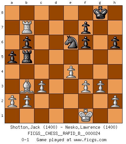 Last move : 0-1 2007 January 29 7:45:54 [Event "FICGS__CHESS__RAPID_B__000024"] [Site "FICGS"] [Date "2006.11.16"] [Round "1"] [White "Shotton,Jack"] [Black "Nesko,Lawrence"] [Result "0-1"] [WhiteElo "1400"] [BlackElo "1400"] 1.e4 e5 2.Nf3 Nc6 3.d4 exd4 4.Nxd4 Bd6 5.Bc4 Nf6 6.Nf5 O-O 7.Nxd6 cxd6 8.Nc3 Re8 9.O-O Ne5 10.Bb3 b6 11.Qxd6 Bb7 12.Bg5 h6 13.Bxf6 Qxf6 14.Qxf6 gxf6 15.Rfe1 Bc6 16.Rad1 Re7 17.Nd5 Bxd5 18.Bxd5 Rc8 19.c3 Rce8 20.f3 Ng6 21.Rd2 Nf4 22.Red1 Re5 23.Bb3 Rg5 24.Kf1 Re7 25.g3 Ne6 26.Rxd7 Rxd7 27.Rxd7 a5 28.Rb7 Rb5 0-1 This chess game has been lost on time (started : 2006.11.16 0:7:54) Scotch game Kingside Castling by player Black (move 6) Kingside Castling by player White (move 9) Player Black won this chess game. Follow this game move after move (download)We cannot resist the fascination of sacrifice, since a passion for sacrifices is part of a Chessplayer's nature. (Rudolf Spielman) Kritik überlasse ich den Spießern. Ich zeige nichts, wofür ich mich schämen muss. (Alexandra Kosteniuk) El Ajedrez es una manera fabulosa para que los niños aprendan a autovalorarse y a autoestimarse. (Saudin Robovic) En blitz, le Cavalier l'emporte sur le Fou. (Vlastimil Hort) Question: Is 'This statement is paradoxical' a paradoxical statement ? Or is it a meta-paradox ? (Normajean Yates)