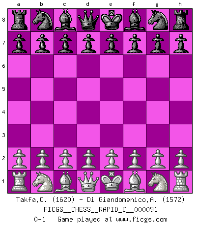 Last move : 0-1 2010 August 26 22:51:5 [Event "FICGS__CHESS__RAPID_C__000091"] [Site "FICGS"] [Date "2010.07.27"] [Round "1"] [White "Takfa,Outahar"] [Black "Di Giandomenico,Alfonso"] [Result "0-1"] [WhiteElo "1620"] [BlackElo "1572"] 0-1 This chess game has been lost on time (started : 2010.07.27 18:18:15) Player Black won this chess game. Follow this game move after move (download)Chess is not like life... it has rules ! (Mark Pasternak) Weshalb minderdergeübte Spieler mit g2-g4 beginnen? Die betreffenden sind unschlüssig, ob sie nun rechts (h4) oder links (f4) beginnen sollen, und in ihrer Ratlosigkeit entschliessen sie sich nach guter Bürgerart dazu, den goldenen Mittelweg zu wählen. (Aaron Nimzowitsch) En el Ajedrez, cuando menos, el valiente hereda la tierra. (Edmar Mednis) Un footballeur joue avec ses pieds, parfois avec sa tête. Un joueur d'échecs ne joue qu'avec sa tête. Et quand il ne joue plus, il meurt. (Jacob Murray) The best weapon against an enemy is another enemy. (Friedrich Nietzsche)