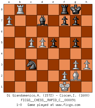 Last move : 1-0 2010 August 19 6:58:58 [Event "FICGS__CHESS__RAPID_C__000091"] [Site "FICGS"] [Date "2010.07.27"] [Round "1"] [White "Di Giandomenico,Alfonso"] [Black "Ciocan,Ioan"] [Result "1-0"] [WhiteElo "1572"] [BlackElo "1600"] 1.e4 c5 2.Nf3 Nc6 3.d4 cxd4 4.Nxd4 Qb6 5.Nc3 Qxd4 6.Qxd4 Nxd4 7.Bd3 e5 8.Be3 Nc6 9.O-O Nb4 10.Nd5 Nxd5 11.exd5 d6 12.h3 Nf6 13.c4 h6 14.b4 Be7 15.a4 O-O 16.a5 Bd7 17.Rab1 Rac8 18.Bxa7 Nh5 19.Rfc1 Nf4 20.Bf1 Bf5 21.Rb3 Bg5 22.Be3 Ng6 23.Bxg5 hxg5 24.c5 dxc5 25.bxc5 Rb8 26.g3 Ne7 27.Bg2 Bd7 28.Rcb1 Nf5 29.Rxb7 Rxb7 30.Rxb7 Bc8 31.Rb6 Nd4 32.a6 Ne2+ 33.Kf1 Nc3 34.a7 Bd7 35.Rb8 1-0 Sicilian defense Kingside Castling by player White (move 9) Kingside Castling by player Black (move 15) Player White won this chess game. Follow this game move after move (download)To avoid losing a piece, many a person has lost the game. (Savielly Tartakover) Auf Remis zu spielen ist gewissermaßen ein Verbrechen gegen das Schachspiel. (Mikhail Nekhemyevich Tal) Solo puedes ser bueno en el Ajedrez si amas al juego. (Bobby Fischer) Horreur, mais aussi harmonie suprême : qu'y avait-il en effet au monde en dehors des échecs ? Le brouillard, l'inconnu, le non-être... (Vladimir Nabokov) True nature is revealed in times of difficulty. (Chinese proverb)