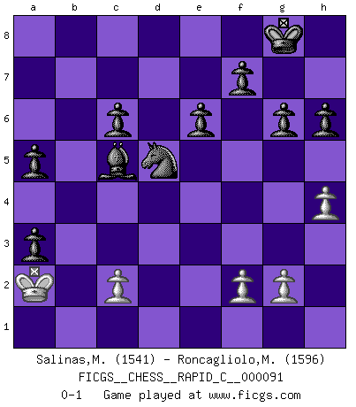 Last move : 0-1 2010 November 3 21:52:37 [Event "FICGS__CHESS__RAPID_C__000091"] [Site "FICGS"] [Date "2010.07.27"] [Round "1"] [White "Salinas,Marcelo"] [Black "Roncagliolo,Marco"] [Result "0-1"] [WhiteElo "1541"] [BlackElo "1596"] 1.Nf3 Nf6 2.e4 d6 3.Bc4 g6 4.Ng5 e6 5.Bb5+ c6 6.Ba4 Bg7 7.d3 O-O 8.Bd2 h6 9.Nf3 a5 10.Bc3 b5 11.e5 dxe5 12.Nxe5 bxa4 13.Qf3 Qd5 14.Nd2 Qxf3 15.Nexf3 Nbd7 16.Nd4 Bb7 17.Nc4 Nd5 18.Nd6 Nxc3 19.bxc3 Bxd4 20.Rb1 Bxc3+ 21.Kd1 Bc8 22.Nxc8 Rfxc8 23.Rb7 Nf6 24.h4 Rab8 25.Rxb8 Rxb8 26.Ke2 Rb2 27.Rc1 Rxa2 28.d4 Ra1 29.Rxa1 Bxa1 30.Kd1 Bxd4 31.Kc1 a3 32.Kb1 Nd5 33.Ka2 Bc5 0-1 This chess game has been lost on time (started : 2010.07.27 18:18:15) Reti Opening Kingside Castling by player Black (move 7) Player Black won this chess game. Follow this game move after move (download)There must have been a time when men were demigods, or they could not have invented Chess. (Gustav Schenk) Habe Mut, dich deines eigenen Verstandes zu bedienen. (Immanuel Kant) Los Peones son nacidos libres, y aún así, se encuentran encadenados por todos lados. (Rick Kennedy) Le moment que je préfère le plus dans une rencontre, c'est celui où je sens que la personnalité de l'adversaire se brise. (Robert Fischer) It's not the size of the dog in the fight, it's the size of the fight in the dog. (Mark Twain)