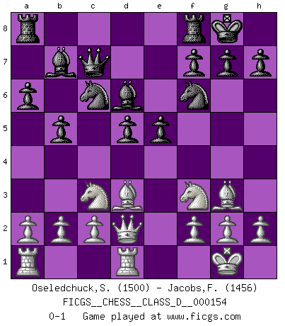 Last move : 0-1 2010 November 2 9:41:54 [Event "FICGS__CHESS__CLASS_D__000154"] [Site "FICGS"] [Date "2010.07.27"] [Round "1"] [White "Oseledchuck,Sergey"] [Black "Jacobs,Francois"] [Result "0-1"] [WhiteElo "1500"] [BlackElo "1456"] 1.e4 c5 2.Nf3 e6 3.d4 cxd4 4.Nxd4 Nf6 5.e5 Qa5+ 6.Bd2 Qxe5+ 7.Be3 Be7 8.Be2 O-O 9.Nc3 Nc6 10.Nf3 Qc7 11.O-O a6 12.Qd2 d5 13.Rfd1 b5 14.Bd3 Bb7 15.Bf4 e5 16.Bg3 Bd6 0-1 This chess game has been lost on time (started : 2010.07.27 18:20:45) Sicilian : Anderssen variation Kingside Castling by player Black (move 8) Kingside Castling by player White (move 11) Player Black won this chess game. Follow this game move after move (download)When you don't know what to play, wait for an idea to come into your opponent's mind. You may be sure that idea will be wrong. (Siegbert Tarrasch) Ich kämpfe solange mein Gegner einen Fehler machen kann. (Emanuel Lasker) El Ajedrez es realmente noventa y nueve por ciento calculación. (Soltis) Il n'y a pas de prix trop élevé au scalp de l'ennemi. (Koblentz) Art is the only way to run away without leaving home. (Twyla Tharp)