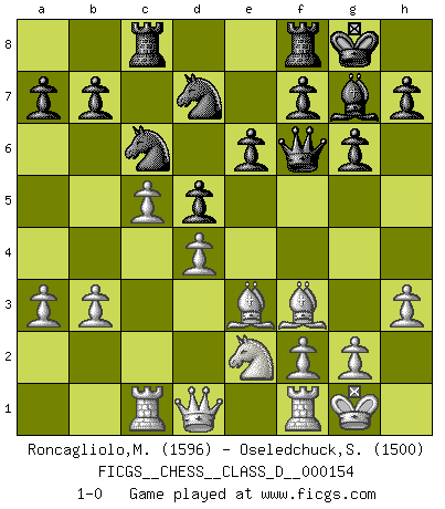 Last move : 1-0 2010 October 27 10:28:55 [Event "FICGS__CHESS__CLASS_D__000154"] [Site "FICGS"] [Date "2010.07.27"] [Round "1"] [White "Roncagliolo,Marco"] [Black "Oseledchuck,Sergey"] [Result "1-0"] [WhiteElo "1596"] [BlackElo "1500"] 1.e4 Nf6 2.e5 Nd5 3.d4 d6 4.Nf3 g6 5.c4 Nb6 6.exd6 cxd6 7.Nc3 Bg7 8.Be2 Nc6 9.Be3 O-O 10.O-O Bg4 11.b3 Rc8 12.Rc1 e6 13.h3 Bxf3 14.Bxf3 d5 15.c5 Nd7 16.a3 Qf6 17.Ne2 1-0 This chess game has been lost on time (started : 2010.07.27 18:20:45) Alekhine's defense : Modern, Fianchetto variation Kingside Castling by player Black (move 9) Kingside Castling by player White (move 10) Player White won this chess game. Follow this game move after move (download)Don't even mention losing to me. I can't stand to think of it. (Bobby Fischer) Wenn ich mich einlogge, glauben die Leute gewöhnlich nicht, dass ich es selbst bin und sie fangen an, mir dumme Fragen zu stellen. Und wenn sie es glauben, stellen sie wieder andere dumme Fragen. (Judith Polgar) El Ajedrez es una guerra en un tablero. El objetivo es aplastar la mente del oponente. (Bobby Fischer) Donnez-moi un Cavalier en 6e et je gagnerais toutes mes parties. (Steinitz) There is a very easy way to return from a casino with a small fortune : go there with a large one. (Jack Yelton)