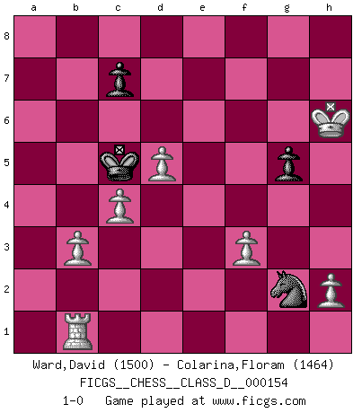 Last move : 1-0 2010 September 30 7:37:0 [Event "FICGS__CHESS__CLASS_D__000154"] [Site "FICGS"] [Date "2010.07.27"] [Round "1"] [White "Ward,David"] [Black "Colarina,Floram"] [Result "1-0"] [WhiteElo "1500"] [BlackElo "1464"] 1.e4 e5 2.Nf3 Nc6 3.Bb5 a6 4.Ba4 Nf6 5.Nc3 b5 6.Bb3 h6 7.O-O Be7 8.a4 O-O 9.axb5 axb5 10.Rxa8 b4 11.Nd5 d6 12.d3 Qd7 13.Ba4 Bb7 14.Rxf8+ Kxf8 15.Nxb4 Nh7 16.d4 d5 17.exd5 Bxb4 18.Nxe5 Qxd5 19.Bxc6 Bxc6 20.Nxc6 Qxc6 21.c3 Bd6 22.Qg4 Nf6 23.Qc8+ Qe8 24.Qxe8+ Nxe8 25.b3 Ke7 26.Bb2 Nf6 27.f3 Nd5 28.c4 Nb4 29.Ba3 Nc2 30.Bxd6+ Kxd6 31.d5 g5 32.Kf2 Nd4 33.Rb1 Kc5 34.Ke3 Nc2+ 35.Ke4 f5+ 36.Kxf5 Ne3+ 37.Kg6 Nxg2 38.Kxh6 1-0 Ruy Lopez : Four knights (Tarrasch) variation Kingside Castling by player White (move 7) Kingside Castling by player Black (move 8) Player White won this chess game. Follow this game move after move (download)Chess is war over the board. The object is to crush the opponents mind. (Bobby Fischer) Mein Name ist Rustam Kamsky. Sie haben meinen Sohn belästigt. Bereiten Sie sich aufs Sterben vor. (Rustam Kamsky) El Ajedrez hace al hombre ser mas sabio y ver mas claro. (Vladimir Putin) On a dit que l'homme se distingue de l'animal par le fait qu'il achète plus de livres qu'il ne peut en lire. Je voudrais suggérer qu'inclure à la liste des livres quelques livres d'échecs rendrait la distinction manifeste. (Edward Lasker) Children in the dark cause accidents, accidents in the dark cause children. (Unknown)