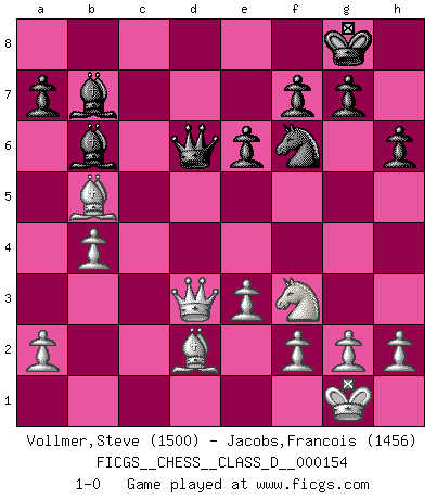 Last move : 1-0 2010 July 31 0:31:21 [Event "FICGS__CHESS__CLASS_D__000154"] [Site "FICGS"] [Date "2010.07.27"] [Round "1"] [White "Vollmer,Steve"] [Black "Jacobs,Francois"] [Result "1-0"] [WhiteElo "1500"] [BlackElo "1456"] 1.d4 d5 2.c4 e6 3.Nc3 Nf6 4.Nf3 Be7 5.Bg5 h6 6.Bd2 O-O 7.e3 c6 8.Bd3 Nbd7 9.O-O dxc4 10.Bxc4 b5 11.Bd3 Bb7 12.Qc2 Rc8 13.Ne4 Qb6 14.Rac1 c5 15.dxc5 Nxc5 16.Nxc5 Rxc5 17.Qb1 Rfc8 18.Rxc5 Bxc5 19.Rc1 Qd6 20.b4 Bb6 21.Rxc8+ Bxc8 22.Bxb5 Bb7 23.Qd3 1-0 QGD : 4.Nf3 Kingside Castling by player Black (move 6) Kingside Castling by player White (move 9) Player White won this chess game. Follow this game move after move (download)I have added these principles to the law: get the Knights into action before both Bishops are developed. (Emanuel Lasker) Man braucht nicht immer den besten Zug zu spielen: Ein Zug muß aktiv, unternehmungslustig, korrekt und schön sein. (David Bronstein) El Ajedrez lo es todo: arte, ciencia y deporte. (Anatoly Karpov) Aux échecs, l'amour-propre est satisfait quand on remporte la victoire, mais il n'y a pas de honte à être battu. (Benjamin Franklin) He who fights with monsters should be careful lest he thereby become a monster. (Friedrich Nietzsche, Beyond Good and Evil)