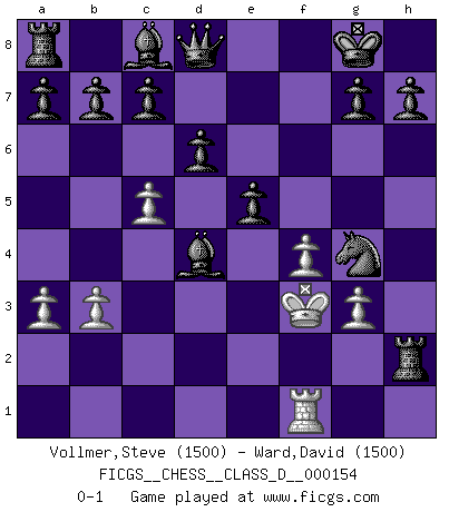Last move : 0-1 2010 October 23 0:37:3 [Event "FICGS__CHESS__CLASS_D__000154"] [Site "FICGS"] [Date "2010.07.27"] [Round "1"] [White "Vollmer,Steve"] [Black "Ward,David"] [Result "0-1"] [WhiteElo "1500"] [BlackElo "1500"] 1.d4 f5 2.c4 Nf6 3.Nc3 e6 4.Nf3 Bb4 5.g3 d6 6.Bg2 O-O 7.O-O Nc6 8.a3 Bxc3 9.b3 Bxa1 10.Qc2 Bxd4 11.Qc3 Bxc3 12.Bb2 Bxb2 13.Nd4 Nxd4 14.f4 Ng4 15.e4 Ne2+ 16.Kh1 Bd4 17.exf5 Rxf5 18.c5 Nxg3+ 19.hxg3 Rh5+ 20.Bh3 Rxh3+ 21.Kg2 Rh2+ 22.Kf3 e5 0-1 Dutch with c4 & Nc3 Kingside Castling by player Black (move 6) Kingside Castling by player White (move 7) Player Black won this chess game. Follow this game move after move (download)Bobby Fischer's current state of mind is indeed a tragedy. One of the world's greatest Chess players - the pride and sorrow of American Chess. (Frank Brady) Man gibt nur Pakete auf. (Paul Keres) No es una movida, aún la mejor movida que tu debas buscar, sino un plan comprensible. (Eugene Znosko-Borovsky) Mon pion favori sur ma case favorite ! Bronstein en parlant d'un coup de pion en h5 quand il avait les Noirs. Internet: Absolute communication, absolute isolation. (Paul Carvel)